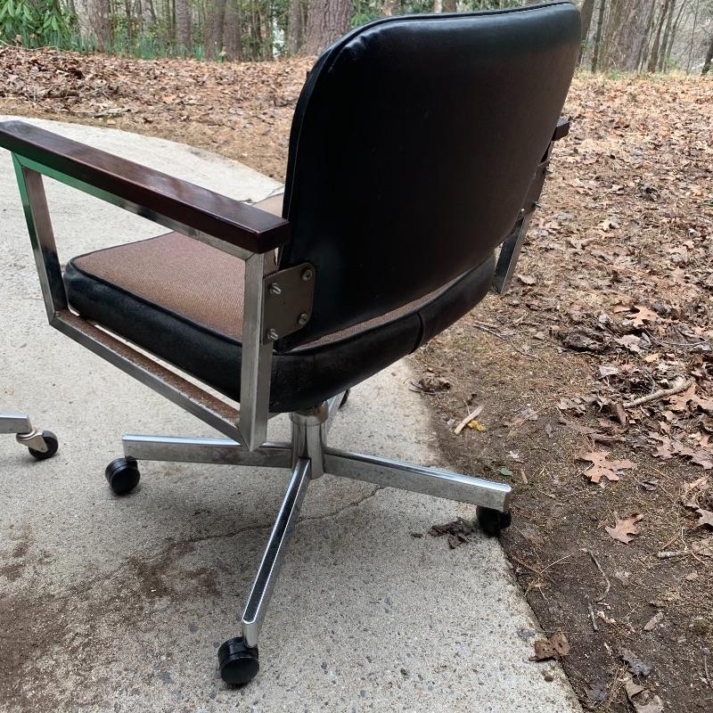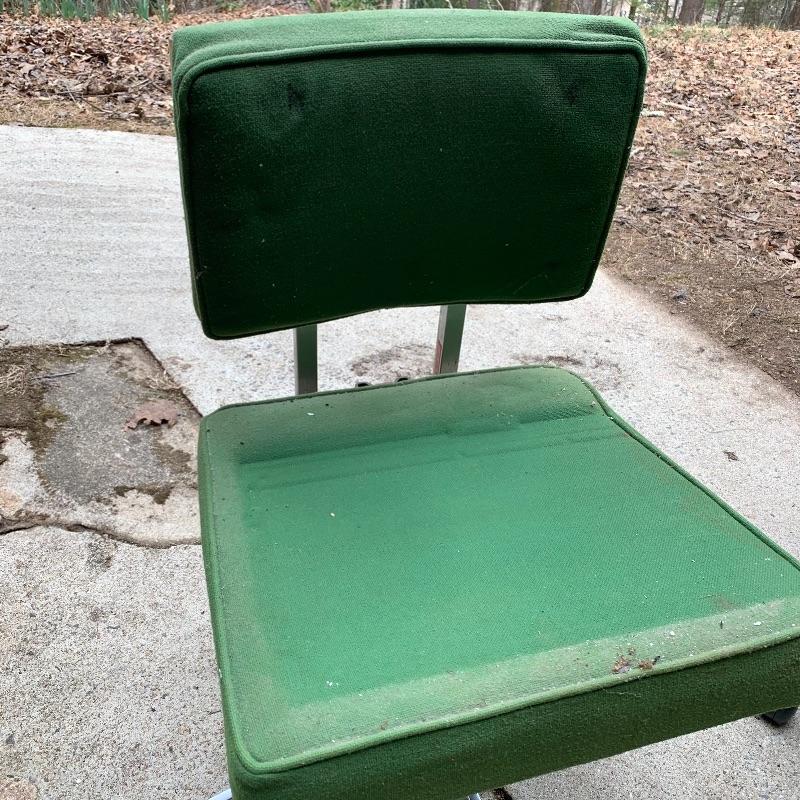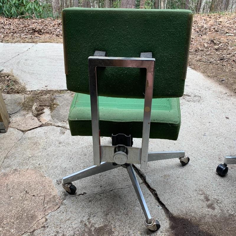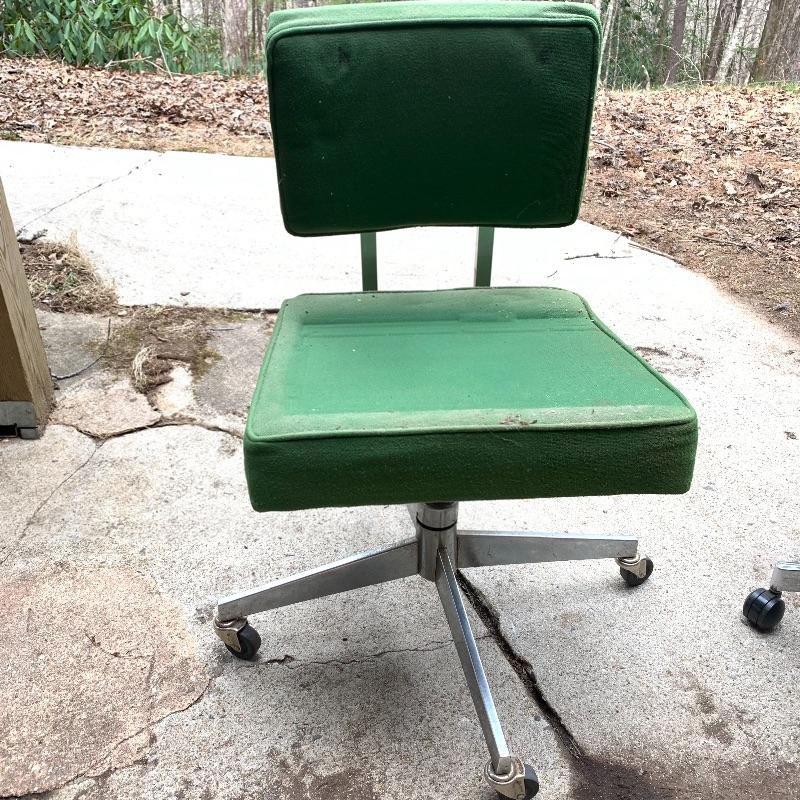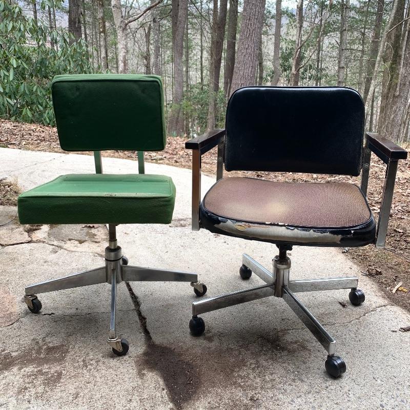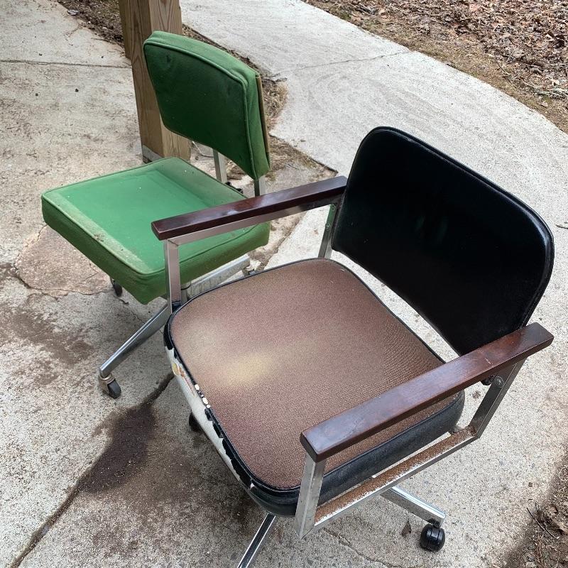 This lot includes one green fabric and metal spin chair and one leather, upholstery and metal spin chair with wooden arms. The green chair has some wear on the fabric. It measures about 33in x 24in. The leather and metal chair has some wear on the seat and the metal is rusting (see photos). It measures about 31in x 25in. Local pick up only.