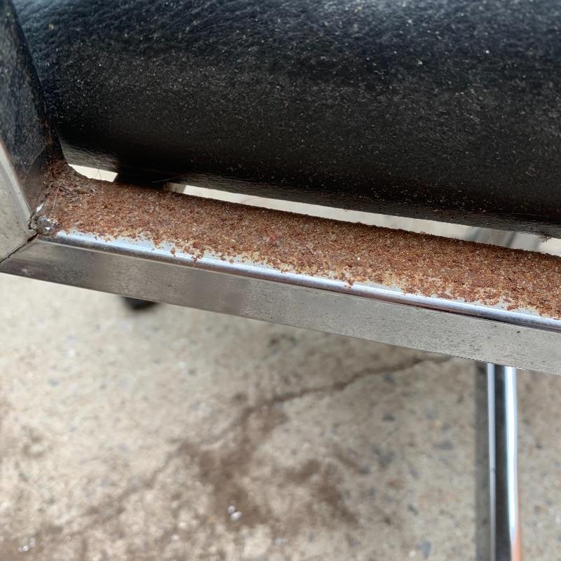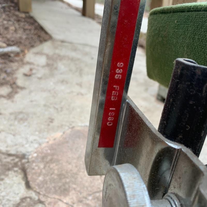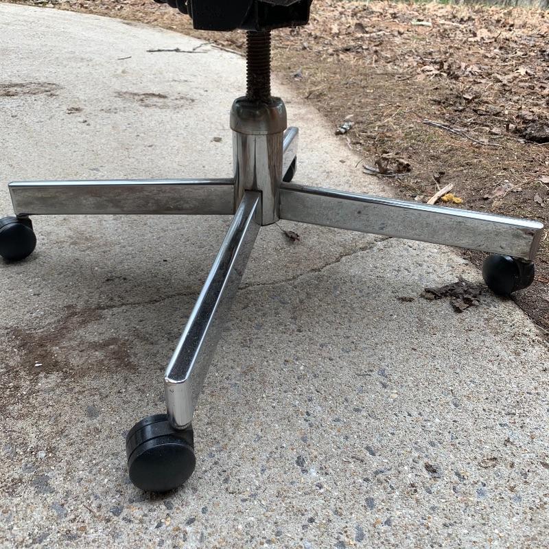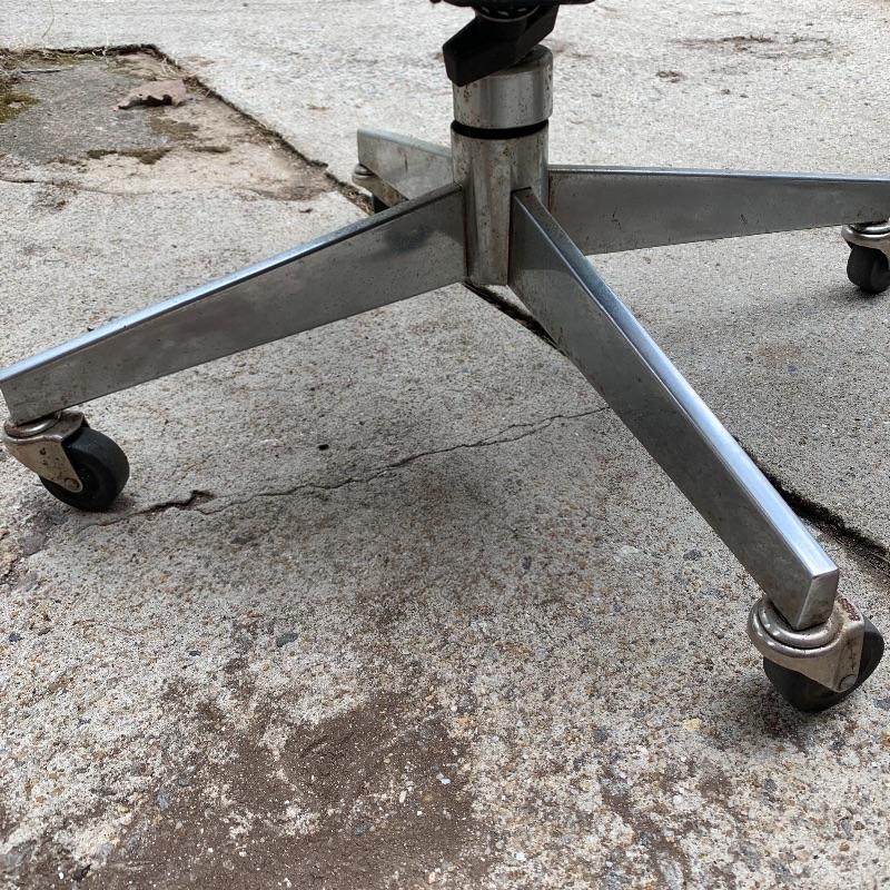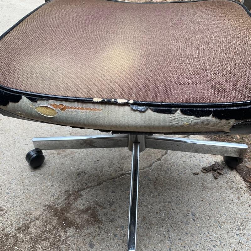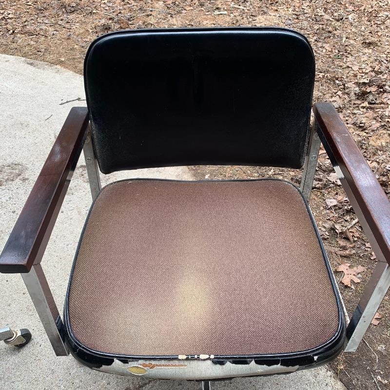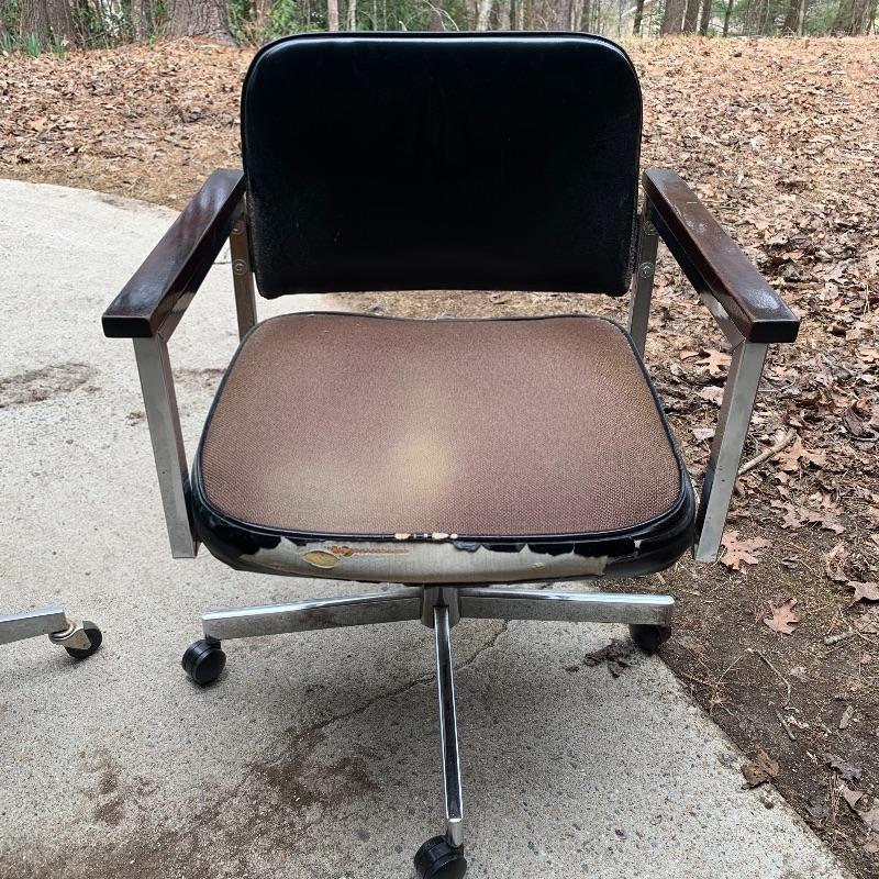 This lot includes one green fabric and metal spin chair and one leather, upholstery and metal spin chair with wooden arms. The green chair has some wear on the fabric. It measures about 33in x 24in. The leather and metal chair has some wear on the seat and the metal is rusting (see photos). It measures about 31in x 25in. Local pick up only.