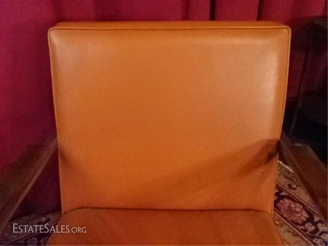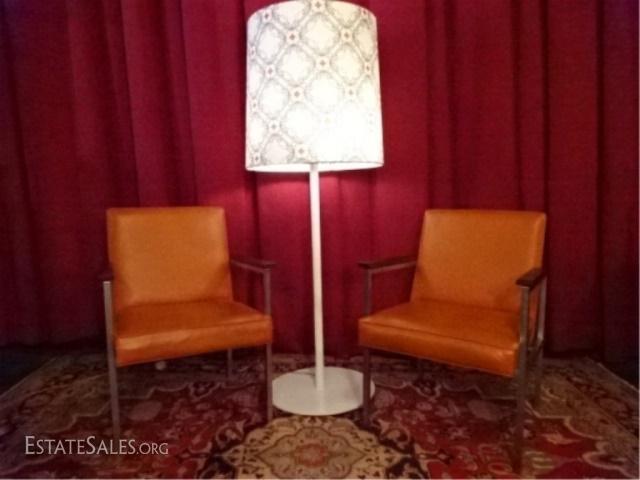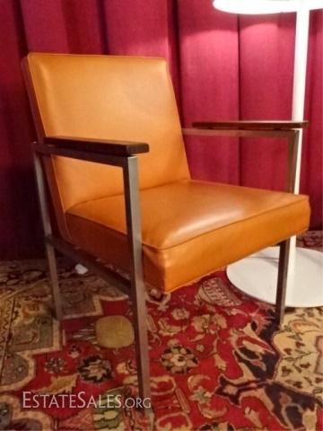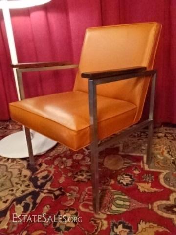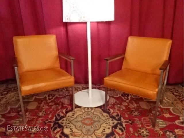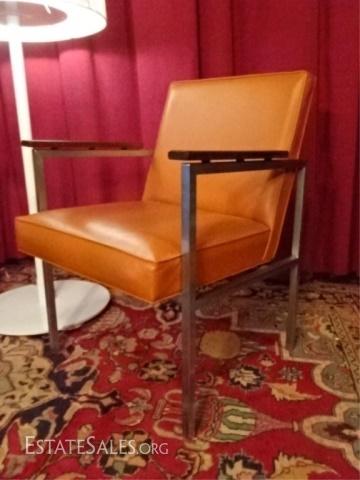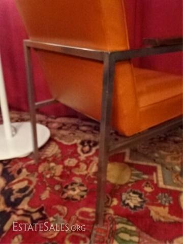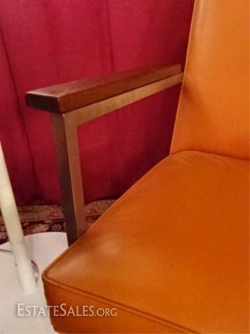 LOT 20A: PAIR MID CENTURY MODERN STEEL ARMCHAIRS, SAFFRON VINYL UPHOLSTERY, WOOD ARMS, VERY GOOD CONDITION, 24" X 25" X 33", SKU355.40