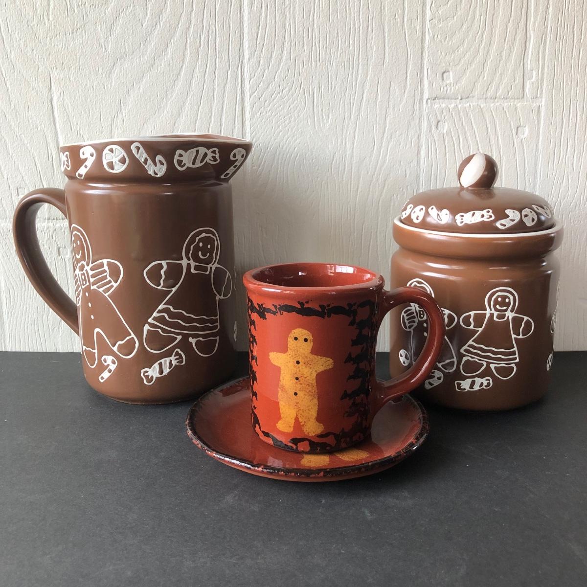 LOT 20G: Gingerbread Kitchen Collection - Stoneware Pitcher & Cookie Jar w/ Tennessee Clayworks Mug & Plate