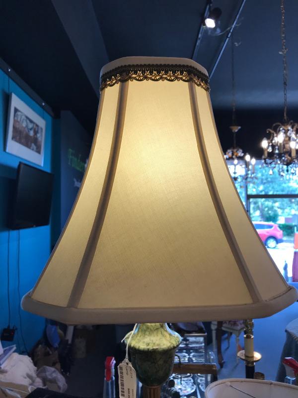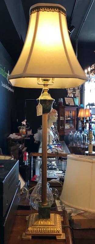Very nice fully restored vintage buffet lamp with gilt metal reeded stem and base with egg and dart and leaf motif. Green marble cube at base and green marble urn at top of stem. Octagonal bell shade with green and gold braid trim accent. 11" x 11" x 33" H