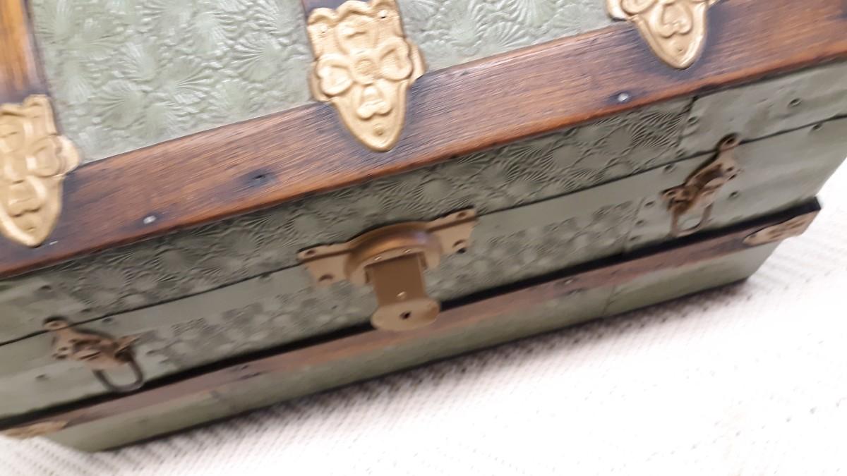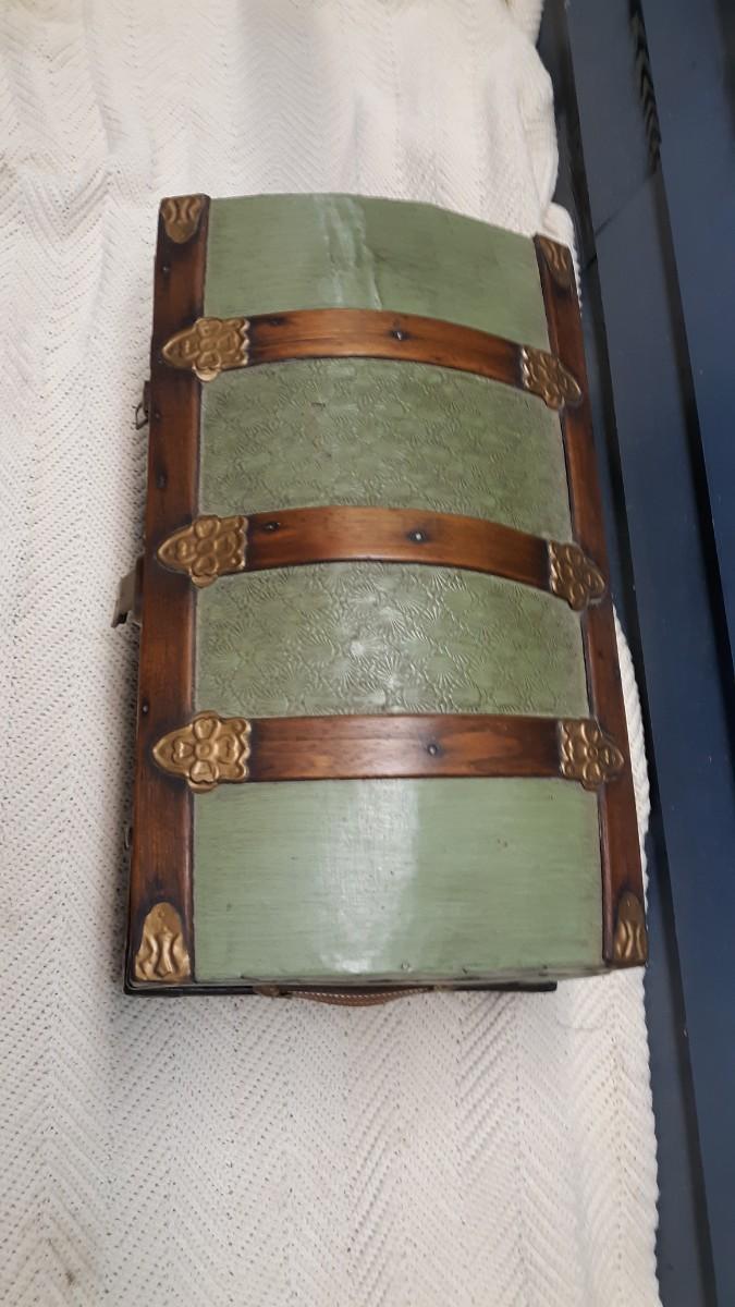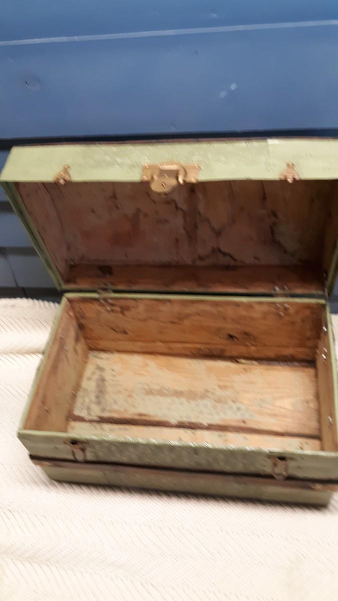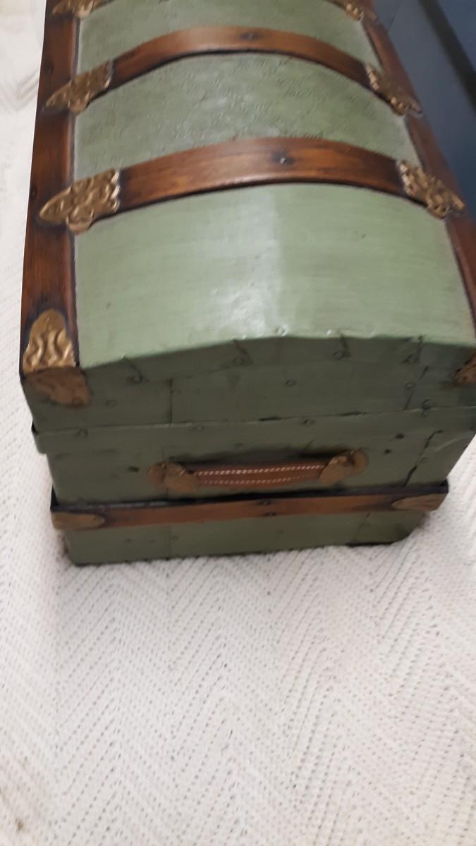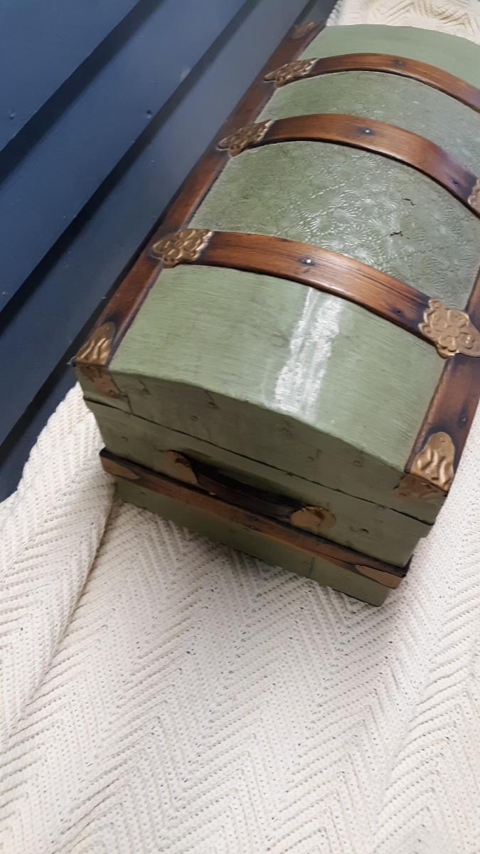 Lot 20-Vintage Wood and Metal Trunk -Greenish in color. A nice collectors piece.