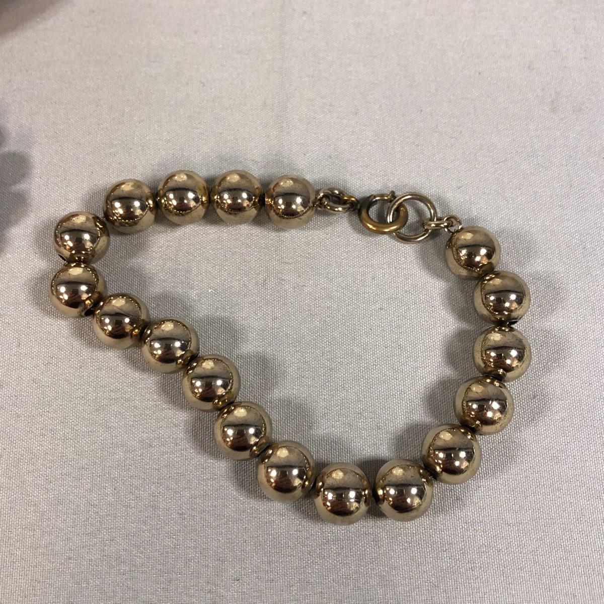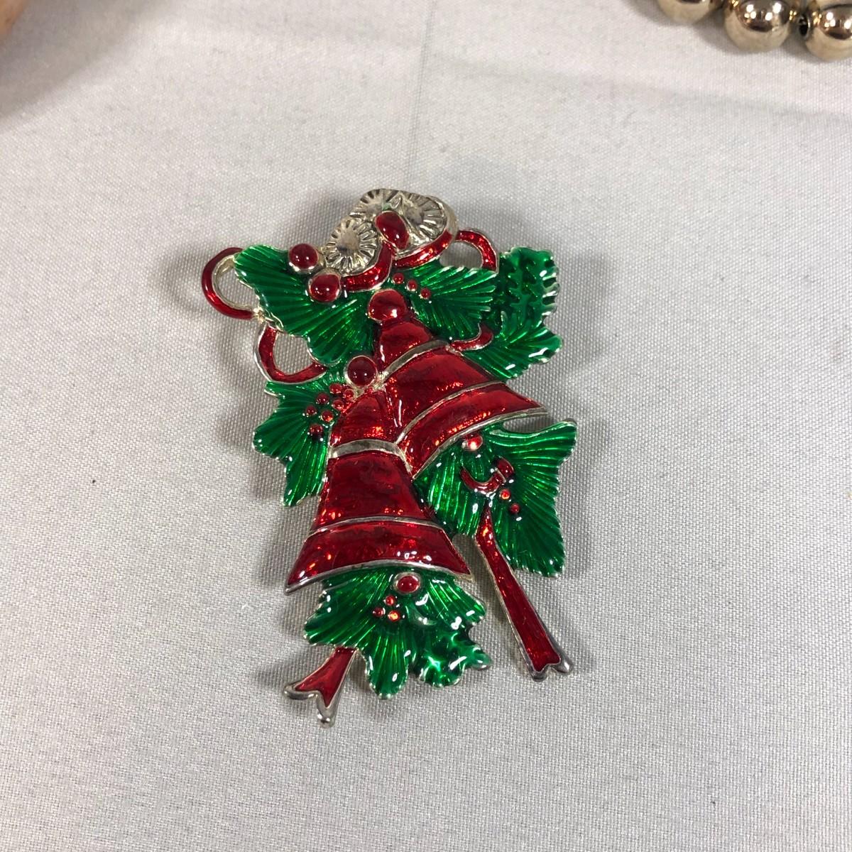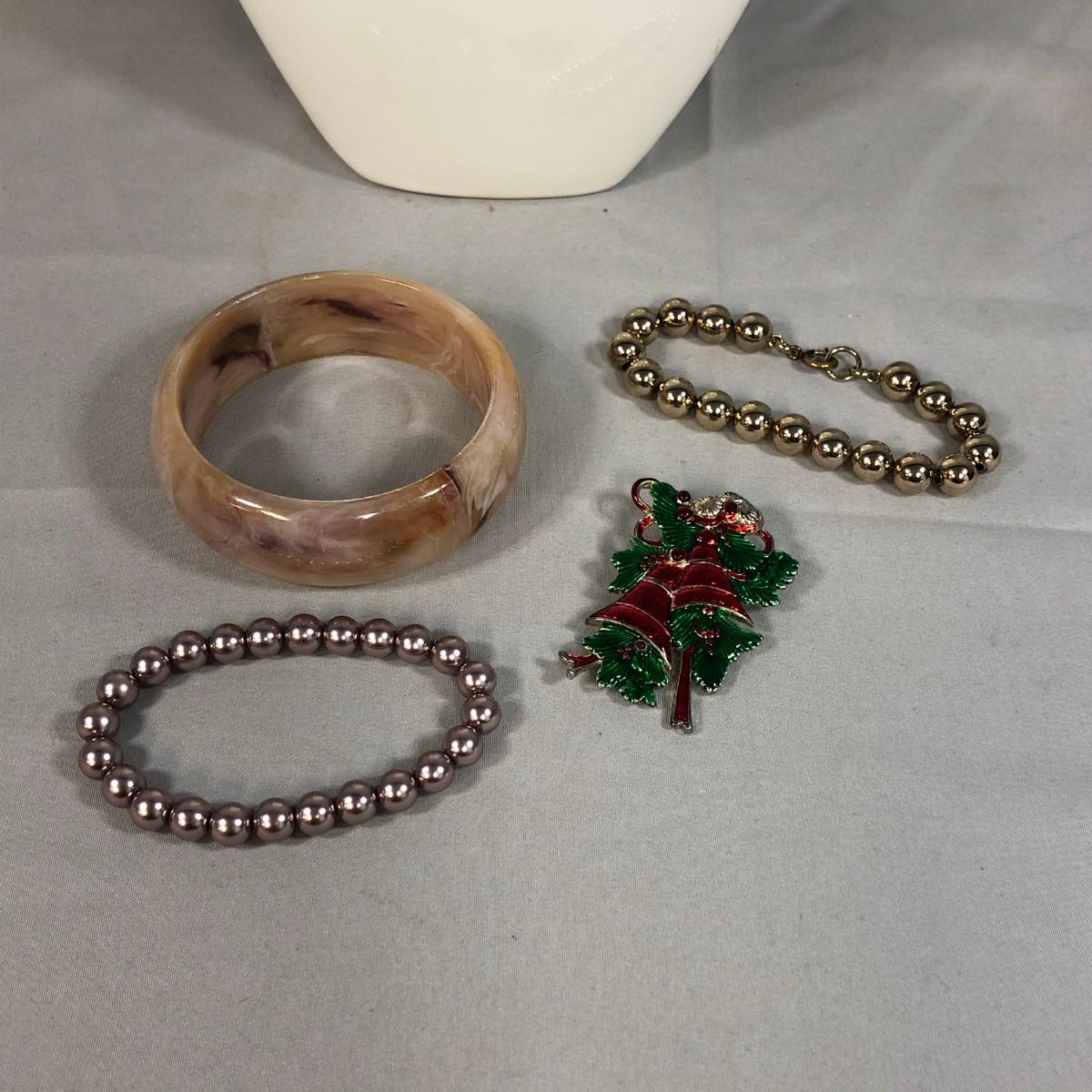 There is a Christmas style brooch that is about 2.25" long, a resin bangle bracelet that is about 2.5" open diameter, a stretch beaded bracelet that is a rose-silver color, and a gold tone beaded bracelet that has metal beads. All are in excellent condition.