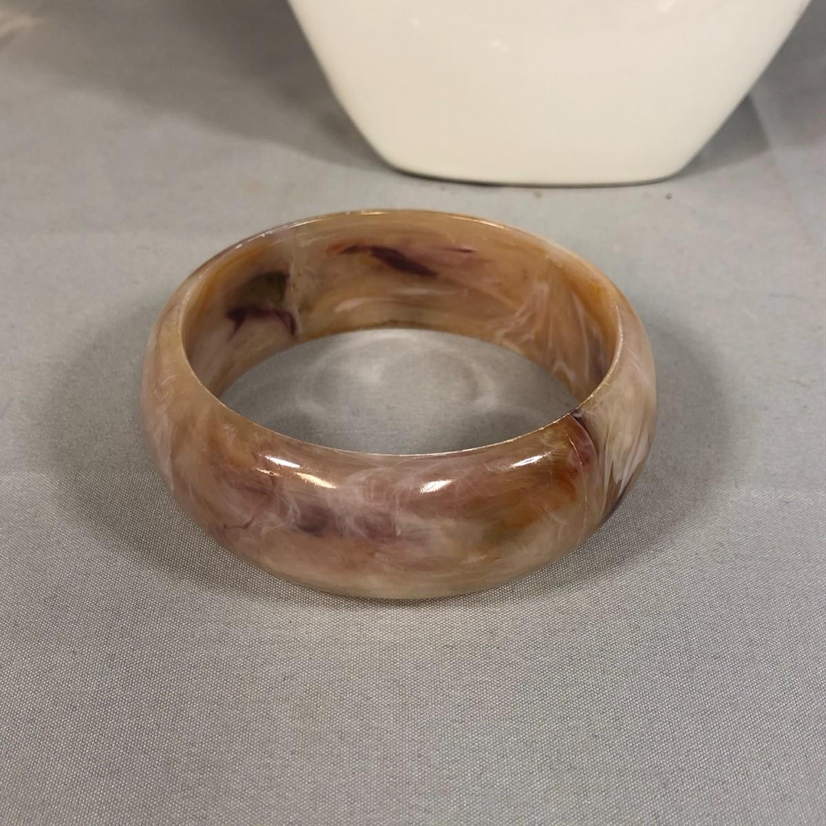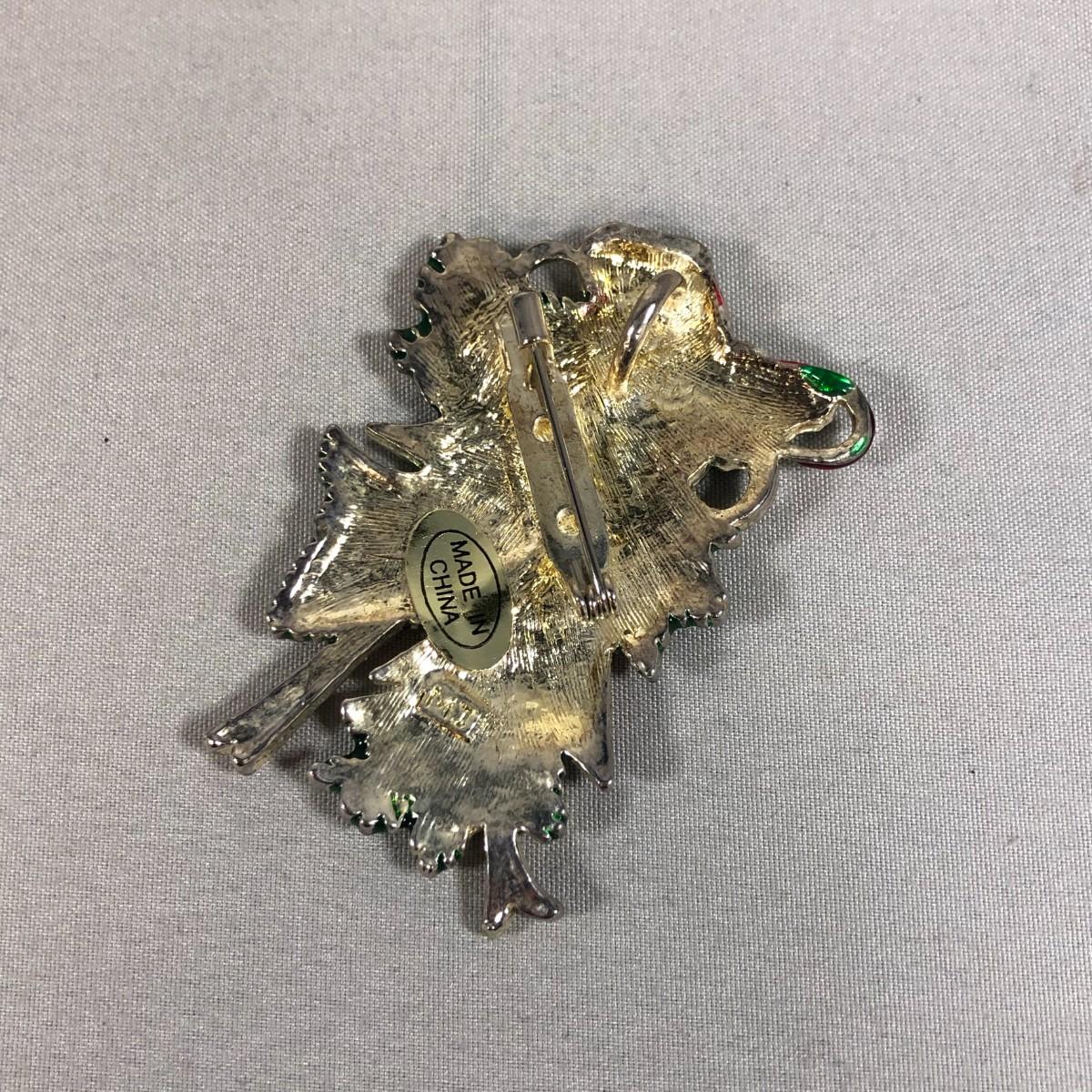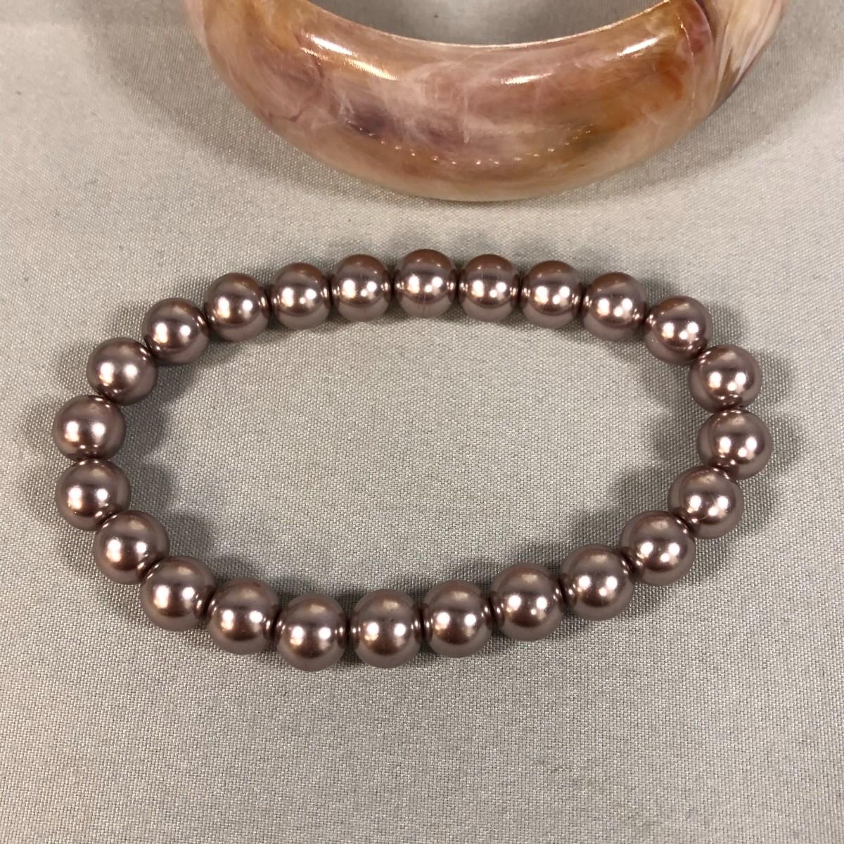 There is a Christmas style brooch that is about 2.25" long, a resin bangle bracelet that is about 2.5" open diameter, a stretch beaded bracelet that is a rose-silver color, and a gold tone beaded bracelet that has metal beads. All are in excellent condition.