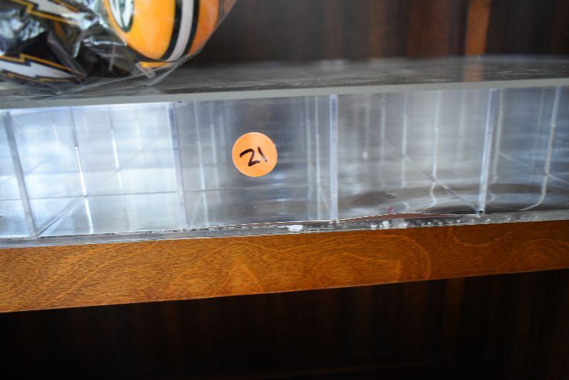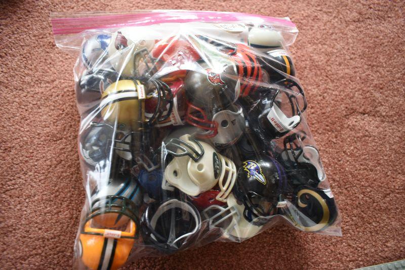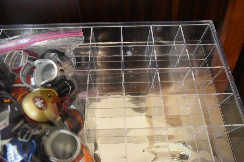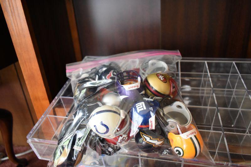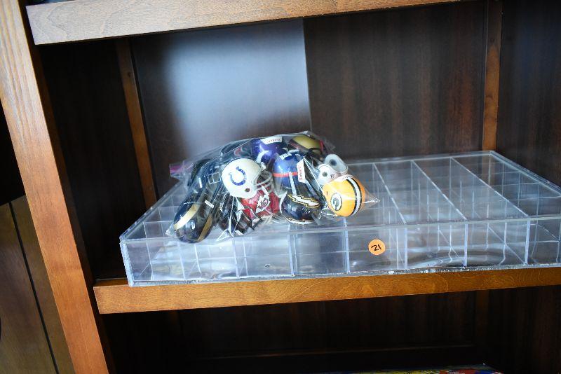 Helmets from NFL teams, and plastic display case.