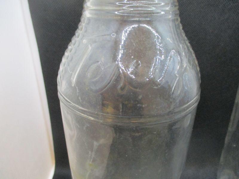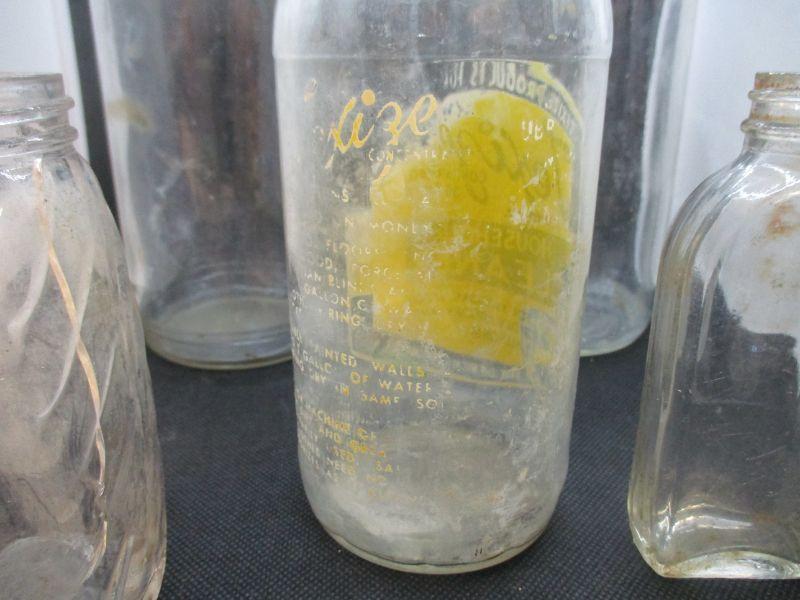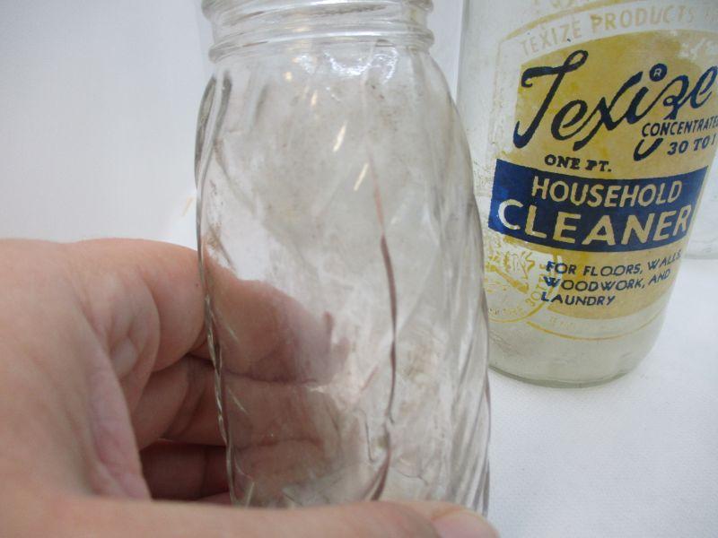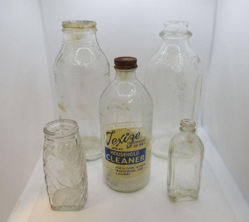 In the back, the tall round bottle is a Texize bottle made between 1945-1953 (the bottle has the Know Glass Bottle Co mark and using the years they were in production and Texize was in production is how I came up with 1945-1953). The other tall bottle in the back is a Biltmore Milk Bottle. The center bottle is Texize and for the same reasons as the other Texize bottle, I believe that it is from 1945-1953. The bottle in the front right looks like a vintage spice bottle and there is a crack in the glass. The final bottle is a Hazel Atlas bottle.