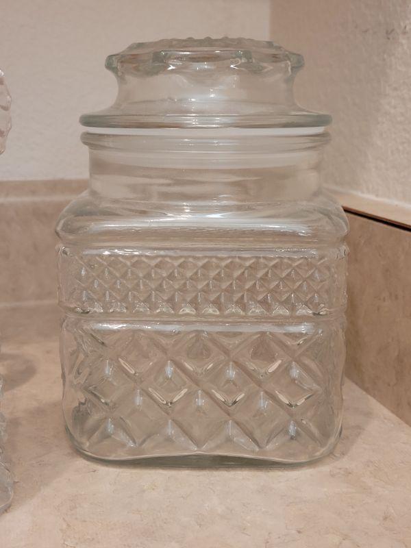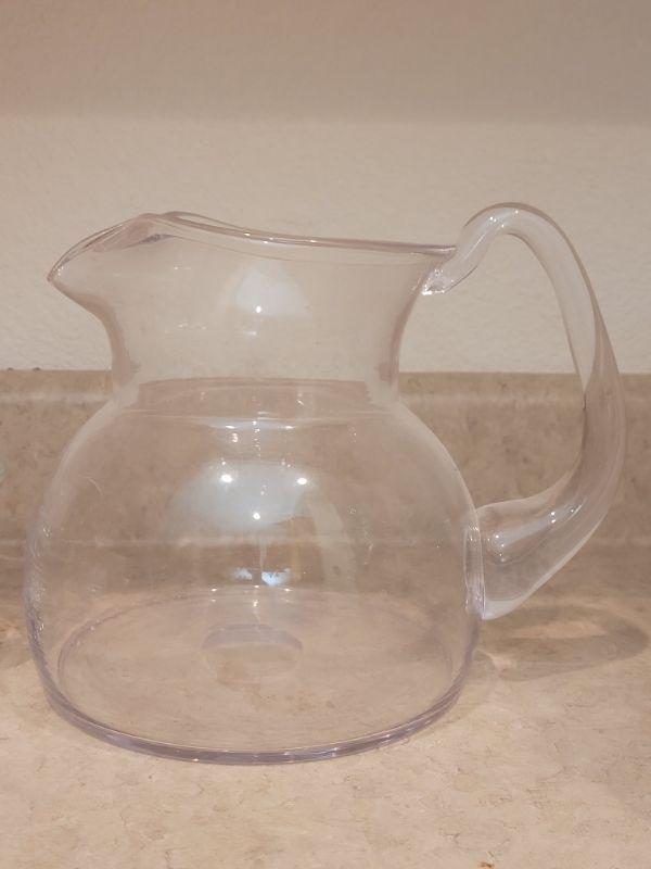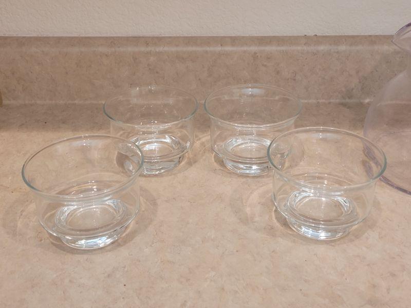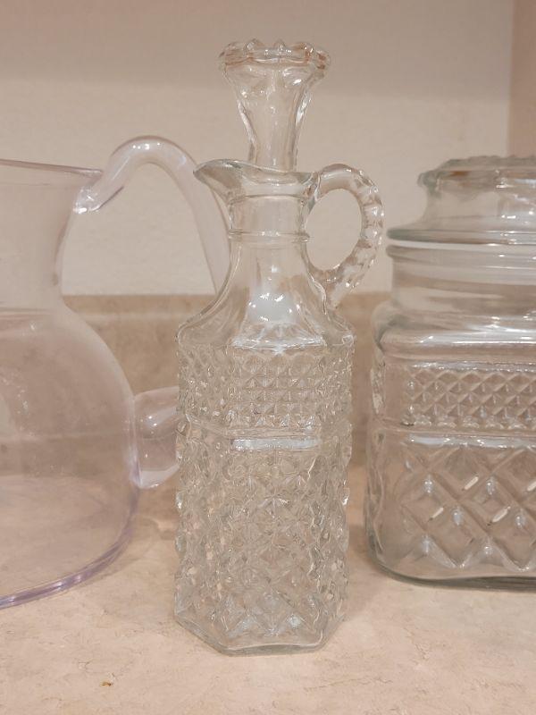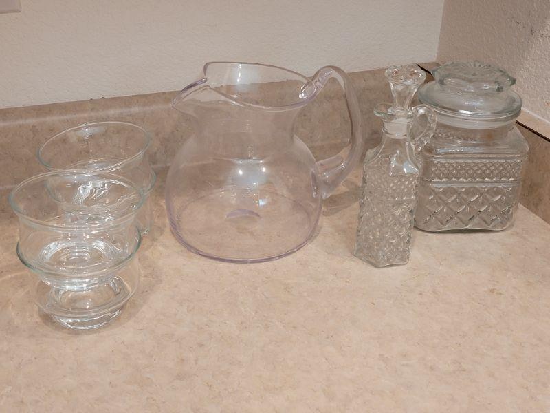 Lot 21: Glass Pitcher, (4) Dessert Bowls, Cut Glass Oil Cruet and Jar