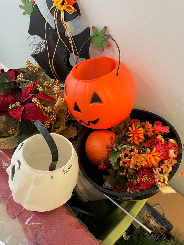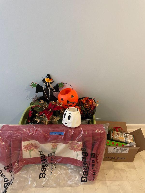 (2) Boxes full of festive Christmas and Halloween Decorations/ Holiday or Seasonal Home Decors, Upholstered Cushion/ Fabric Pieces
