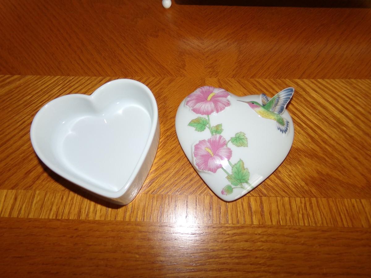 PORCELAIN DOVE FIGURE, THREE LITTLE BLUE BIRDS ON A MIRRORED TRAY & HEART TRINKET BOX