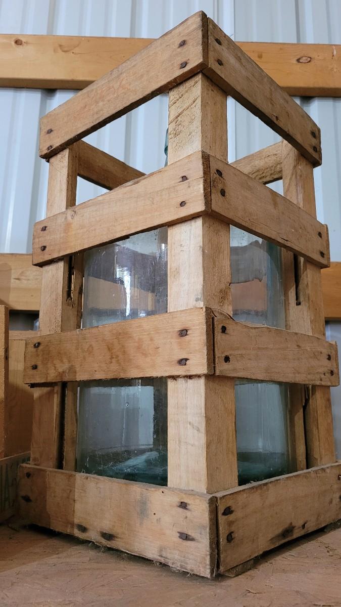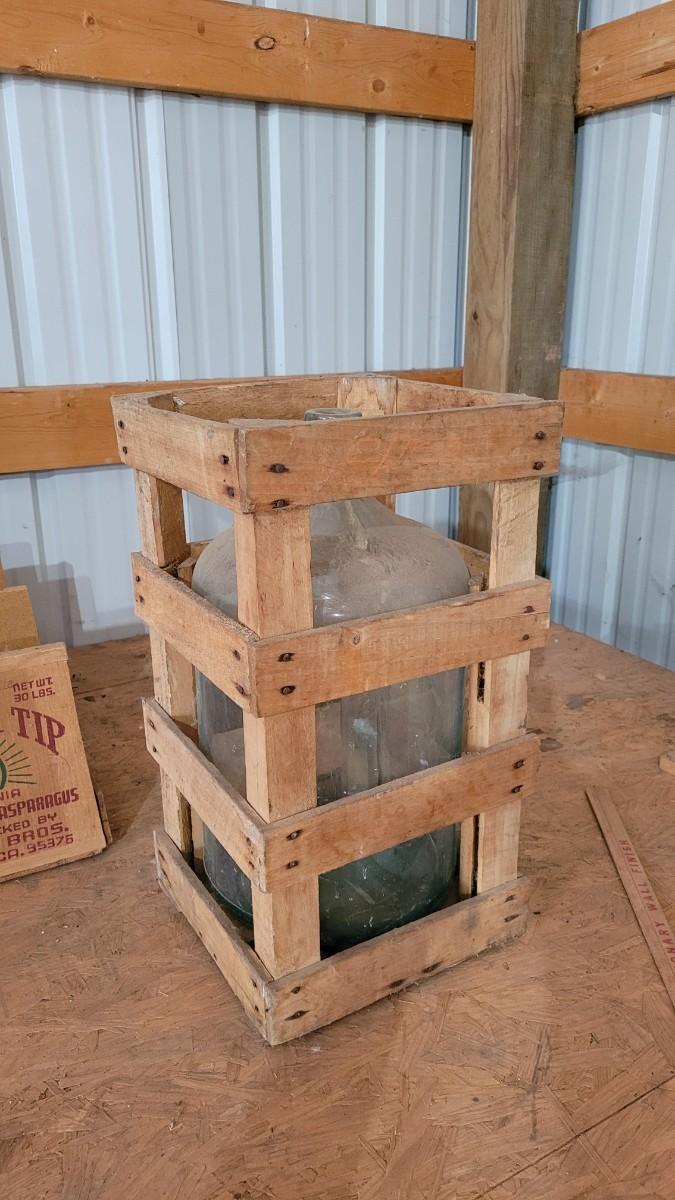 Lot 21: Vintage Heavy Glass Jug w/ Wooden Crate Protective Case Farmhouse Display