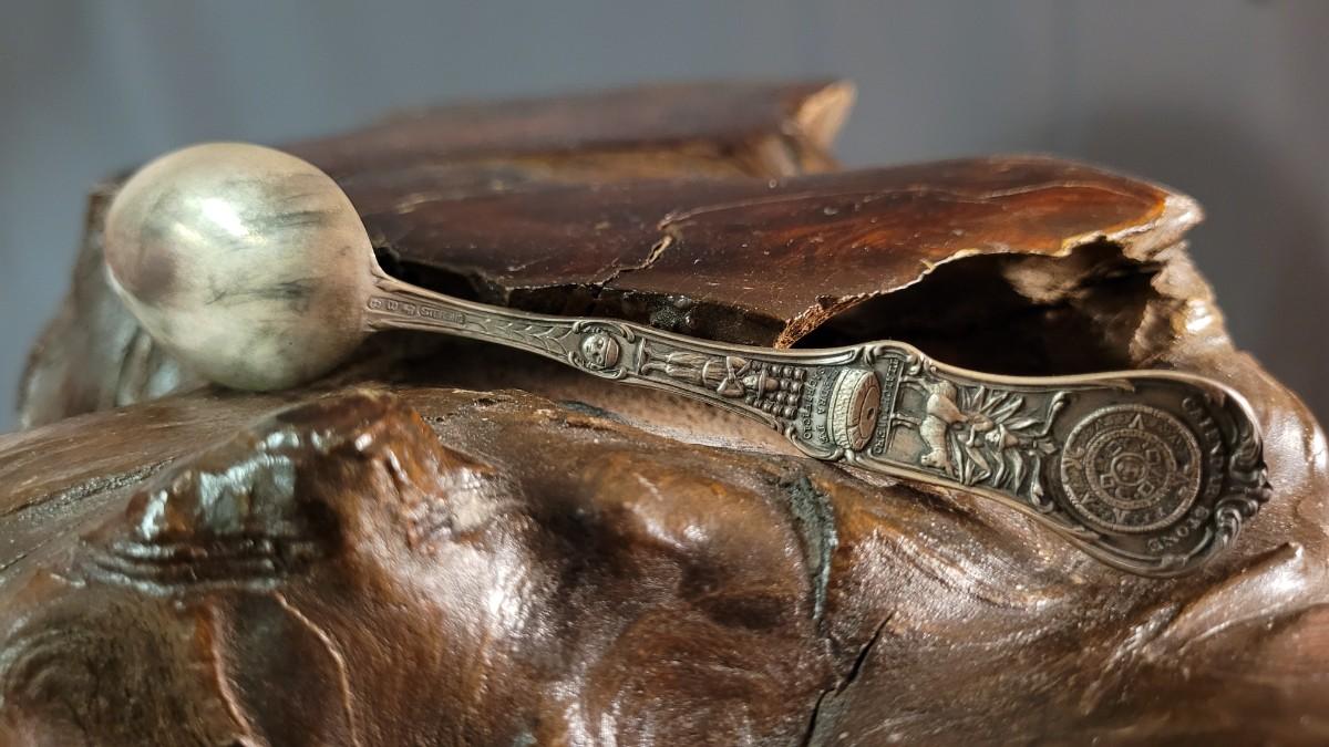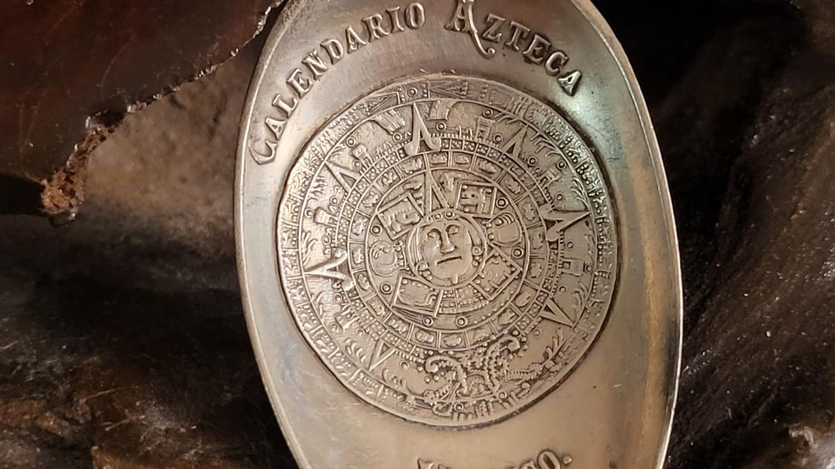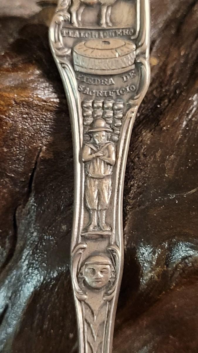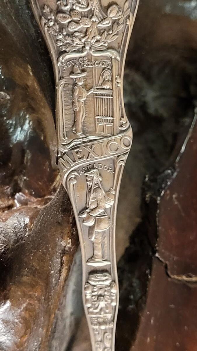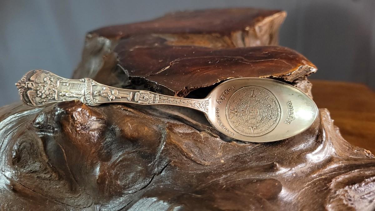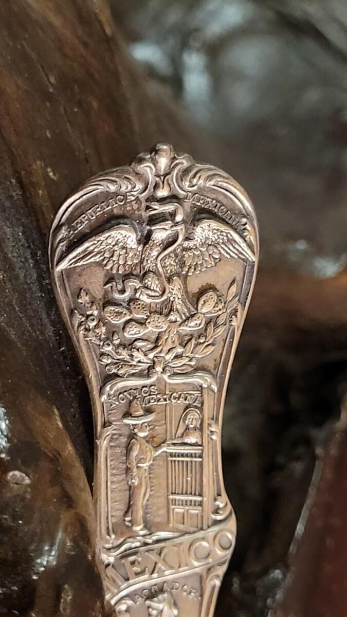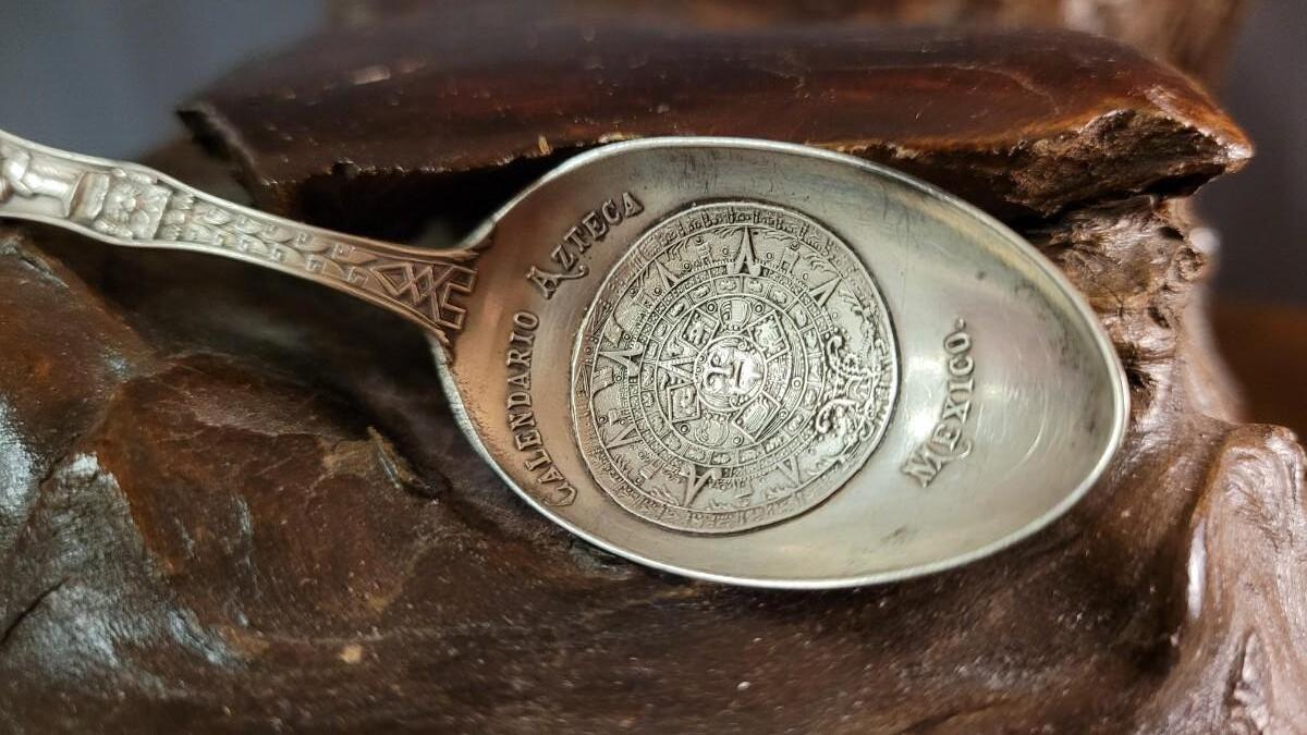 This lot features a Sterling Silver Spoon with the Aztec Calendar on the front face of the spoon along with many other accent details including the Mexico Official Crest that the top. Weighs just over 20 grams. 5.5" Long.