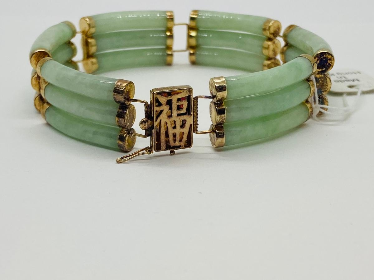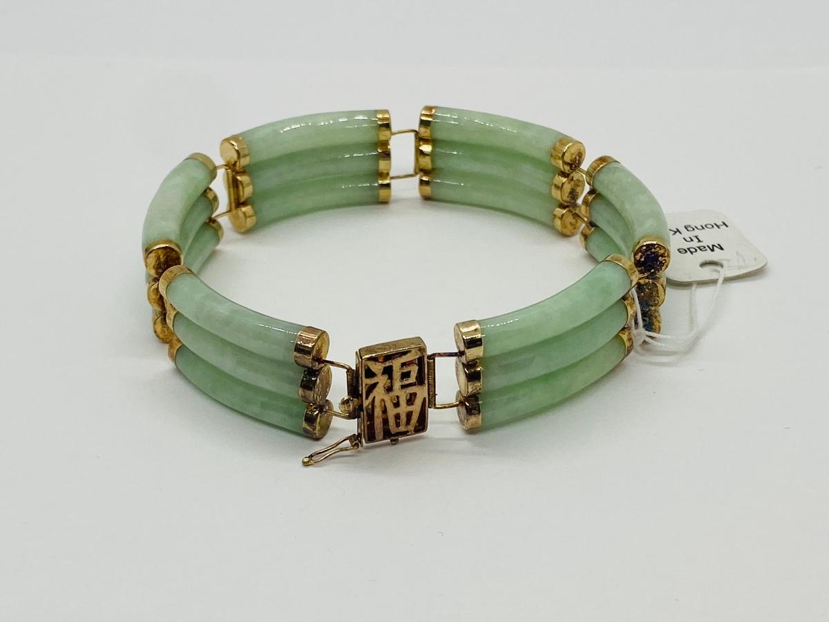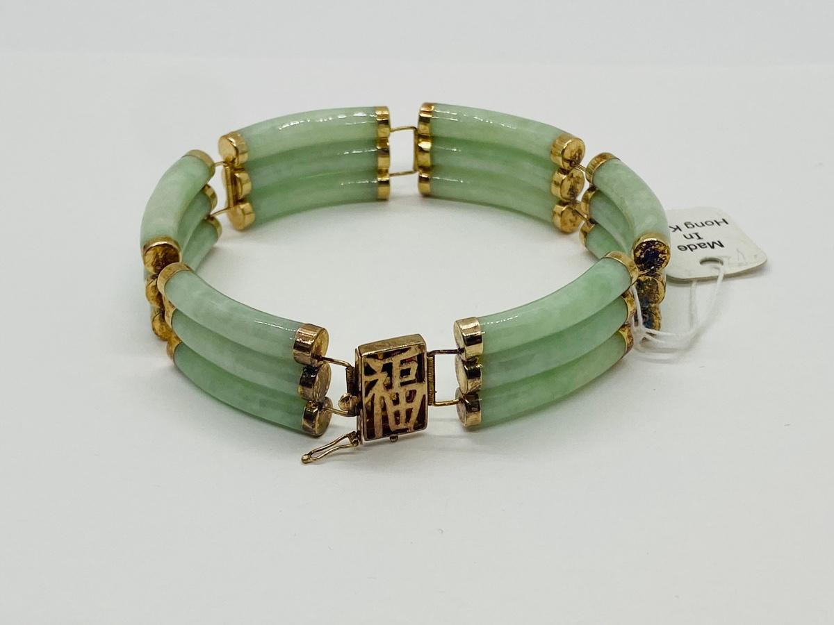 Lot 21: Vintage Hong Kong Good Luck 14k Gold & Jade Bracelet w/ Barrel Clasp. Tag still on it!
