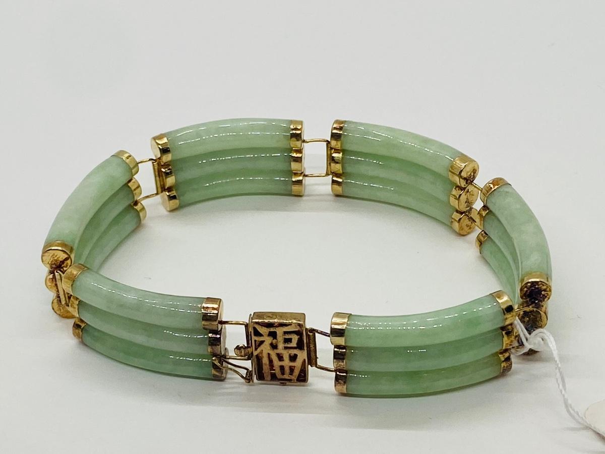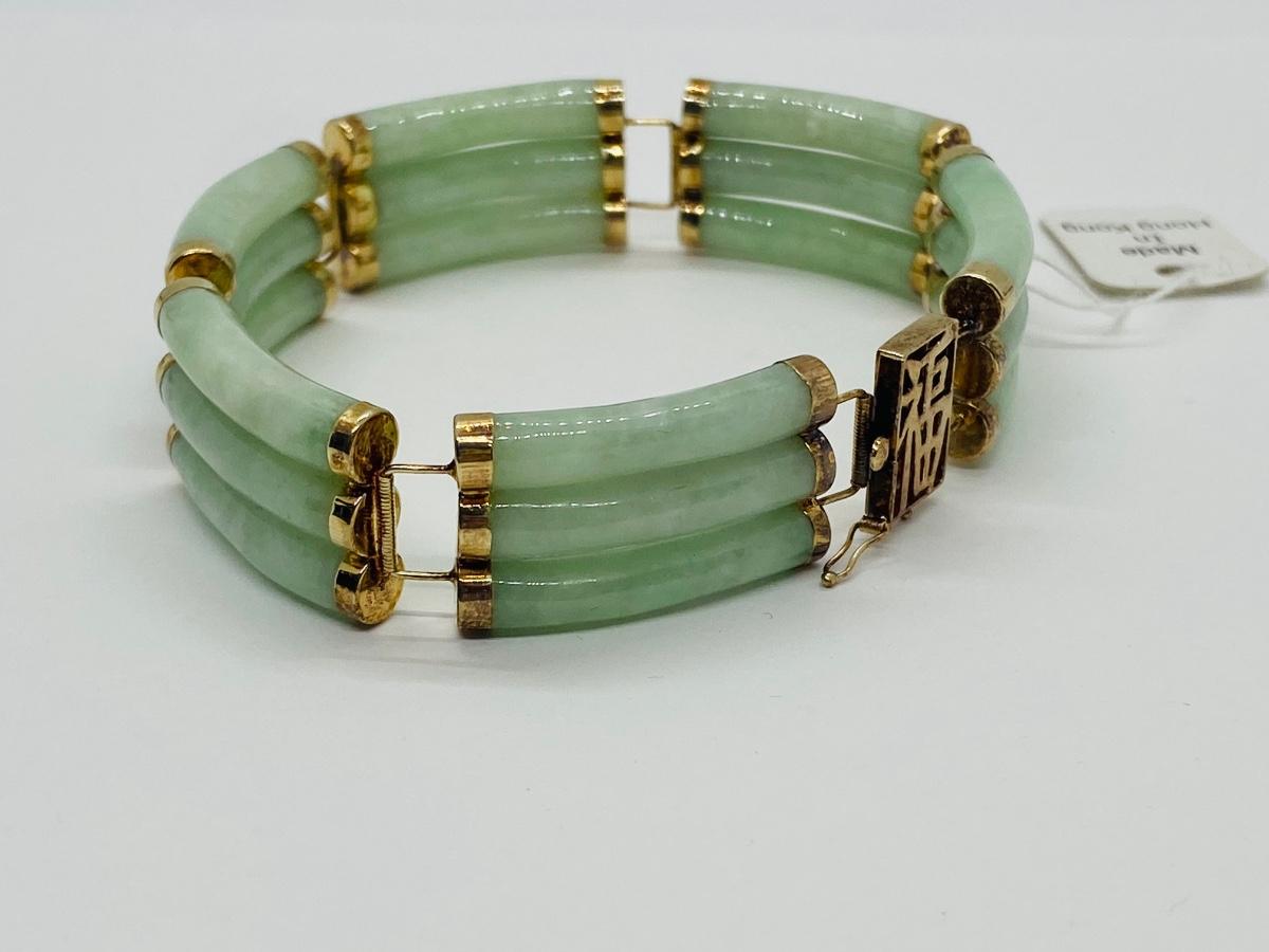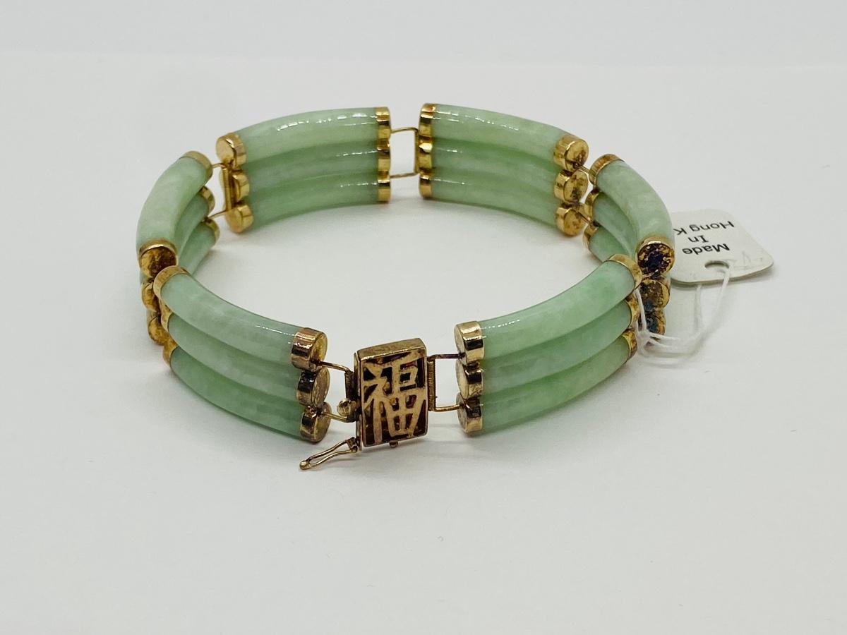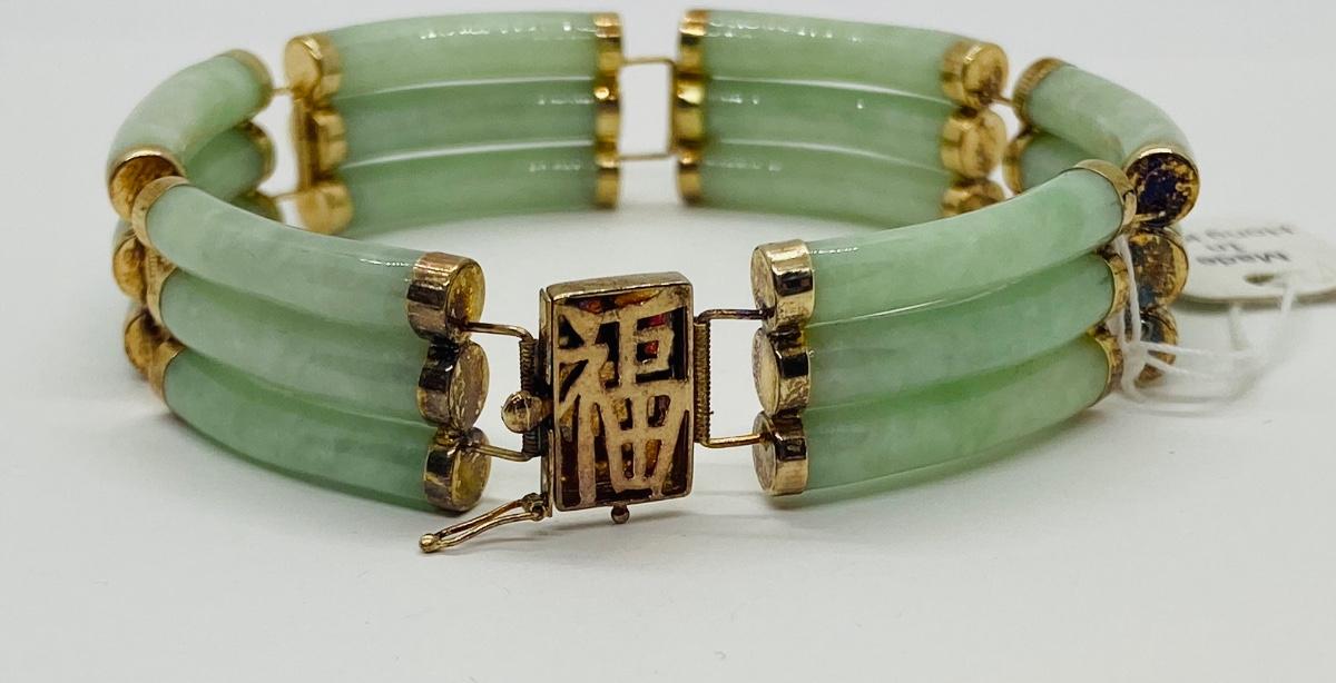 Lot 21: Vintage Hong Kong Good Luck 14k Gold & Jade Bracelet w/ Barrel Clasp. Tag still on it!