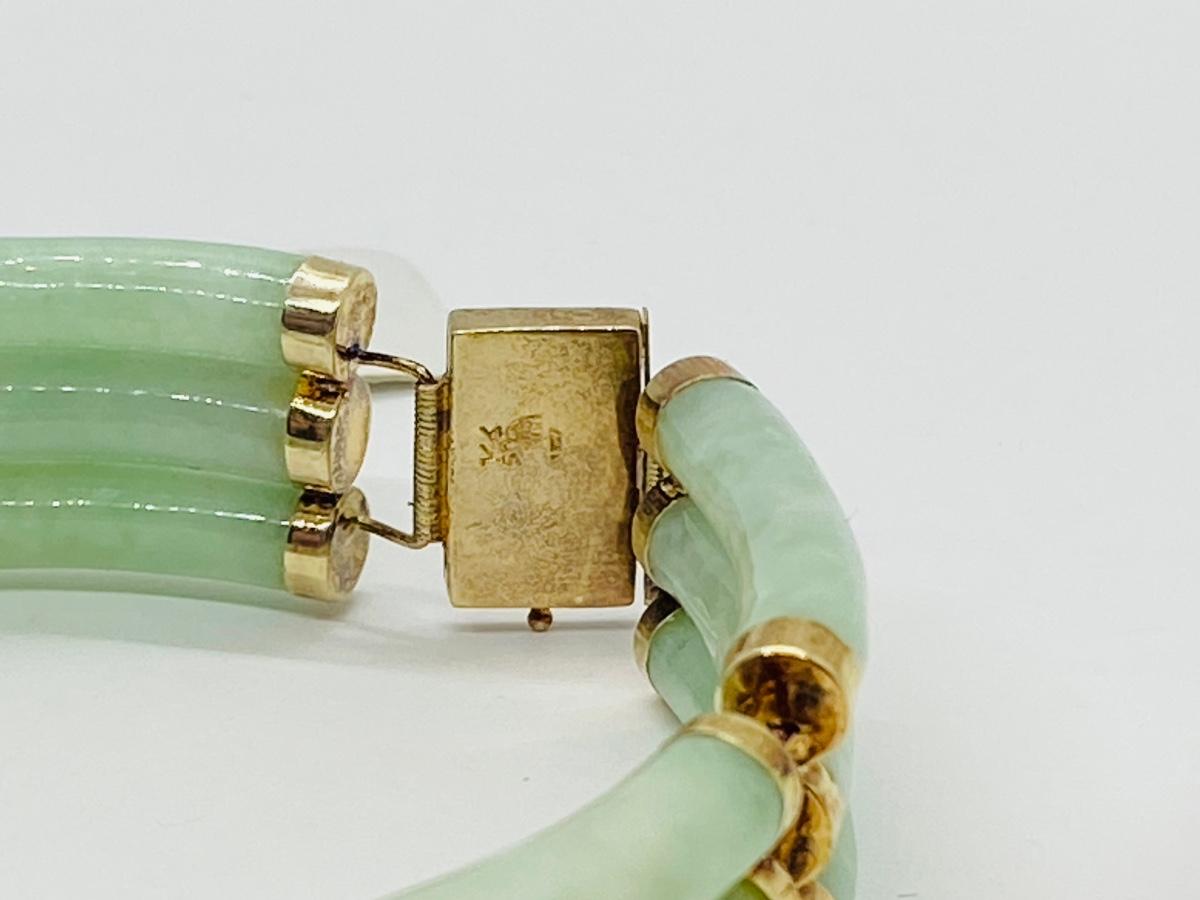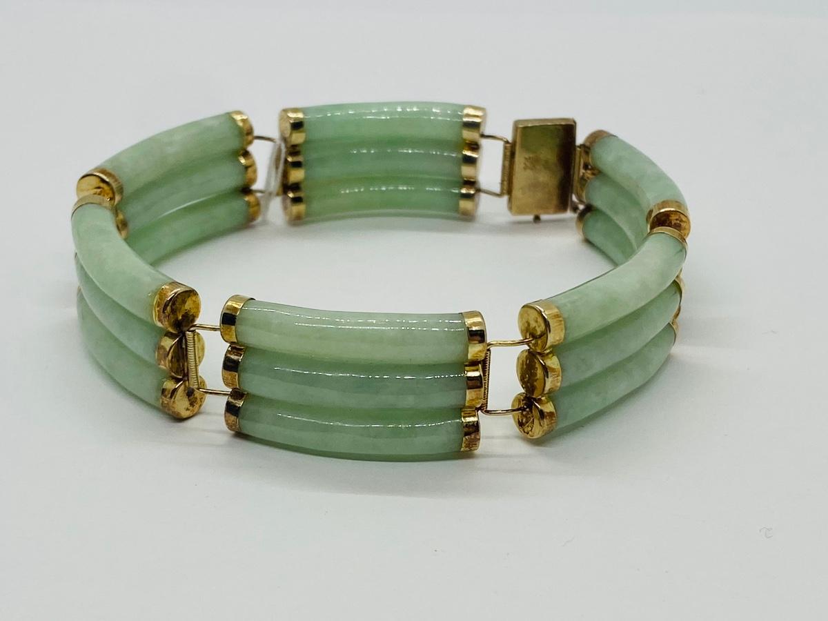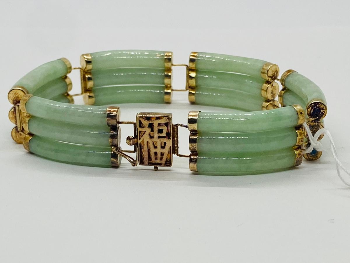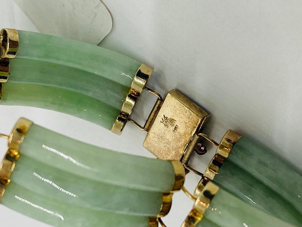 Vintage Hong Kong 14K Yellow Gold Elegant Jade Link bracelet. According to Chinese culture, if your soul feels like it needs a little healing, you should reach for some jade. This brilliant gemstone holds a lot of cultural weight: it is said to bring its wearer happiness, health and good fortune. A great talisman to wear into 2022! Don't forget Valentine's Day is not that far away, this would make a wonderful gift! The pictures show condition, measurements if taken, and what is included in the lot. Due to the large amount that we photograph and the time frame, we are not always able to take measurements. All items unless noted, are pre-owned and have been used, and are untested. Thank you