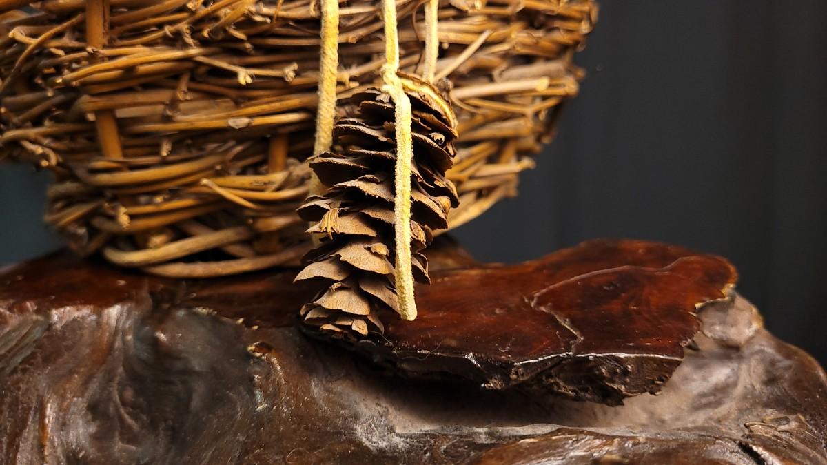 This lot features a vintage Native American style woven wood basket with an antler handle. Various accents of leather straps and additional bone segments/beads make this an attractive home décor basket with dozens of possible uses. 8" x 4.5".
