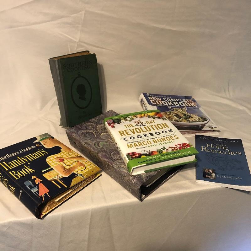 Delightful assortment of cookbooks and more here. The oldest of the bunch is a Southern Cooking book from 1928. The binding of this book is secured with duct tape but all pages seem to be secure. Also included is a charming Better Homes & Garden Handy Man Guide from 1951 in great condition. There are three newer healthy cookbooks and a very lovingly created family book of recipes from Mrs. Betts. This is a great buy for anyone who loves being creative in the kitchen. Shipping Available.