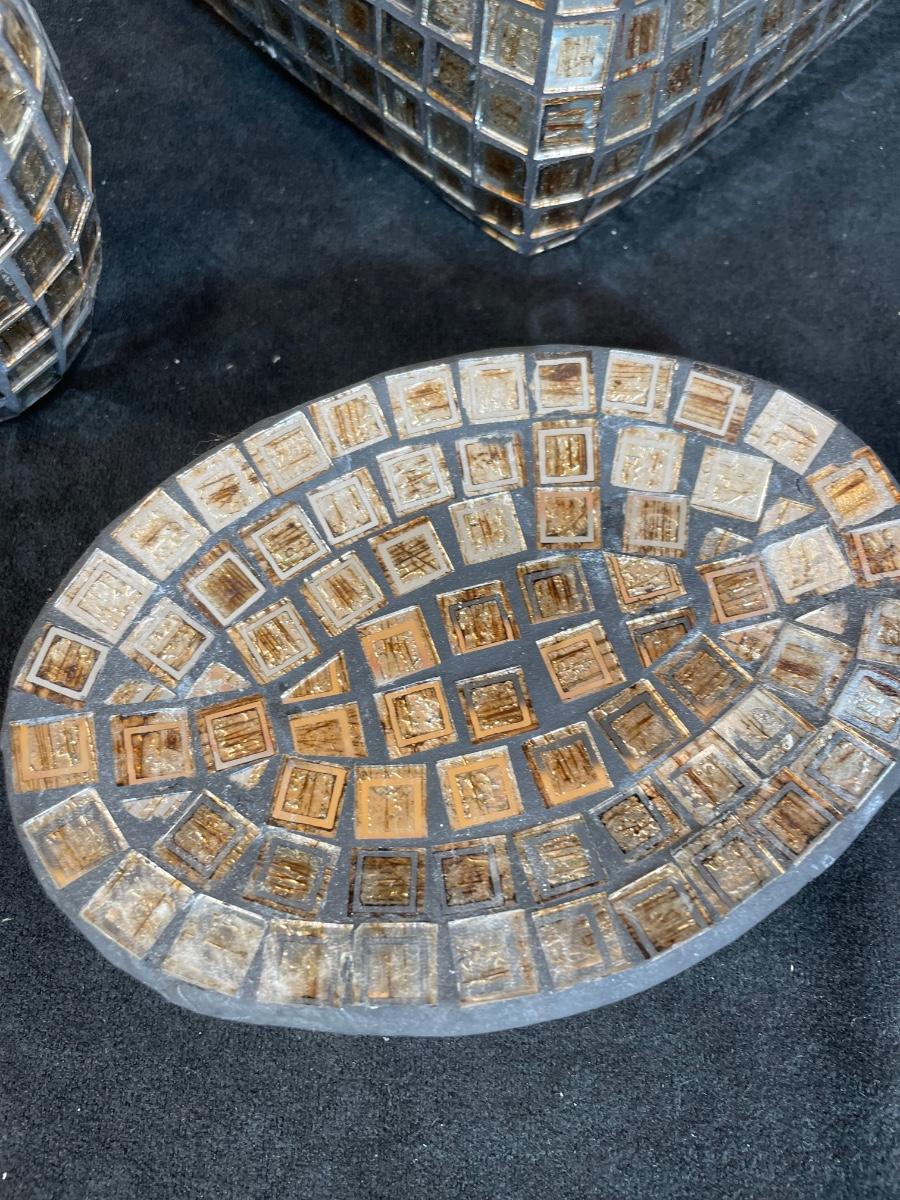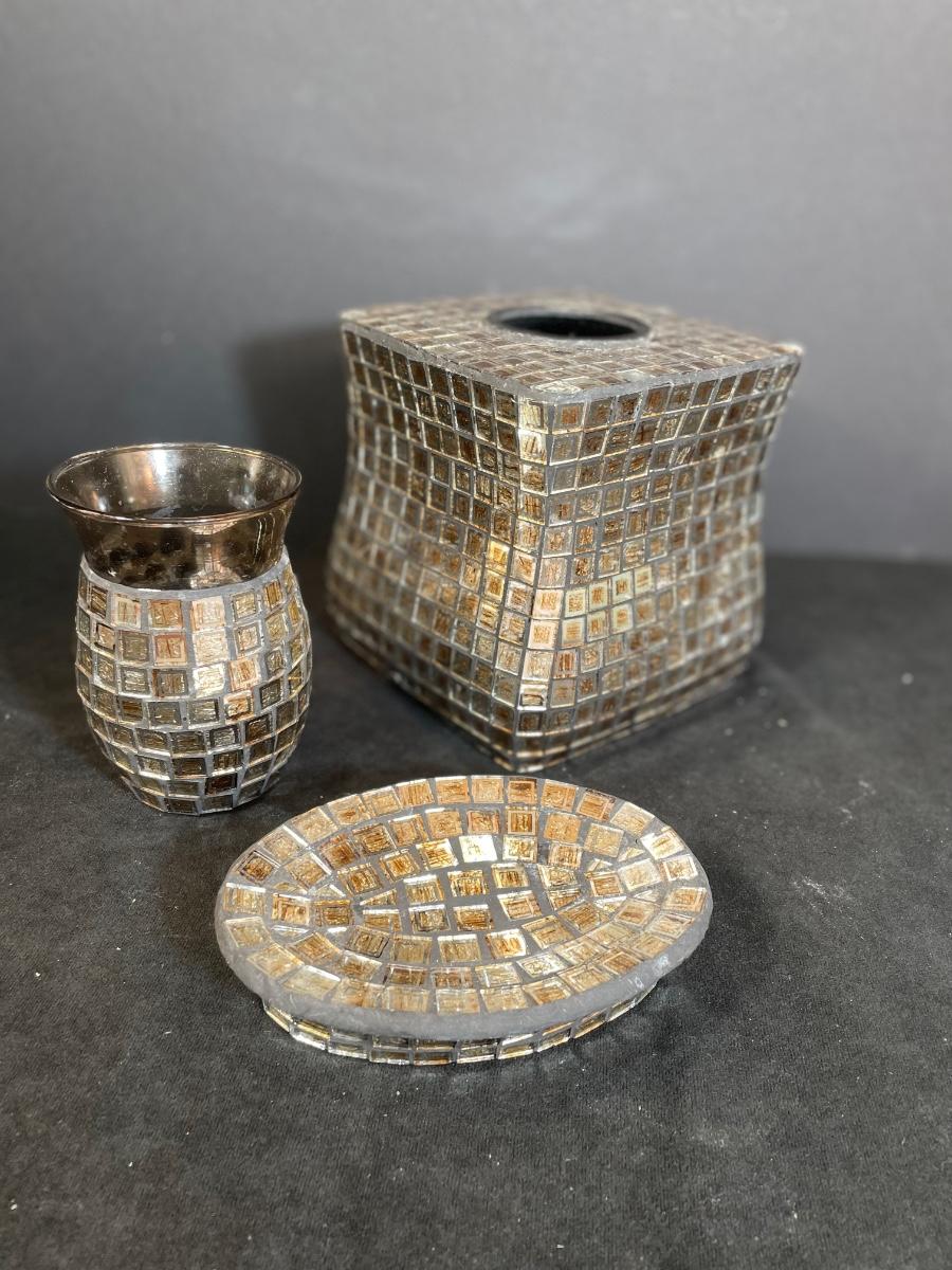 3-piece matching Mosaic Gold glass tissue box cover, cup and soap dish