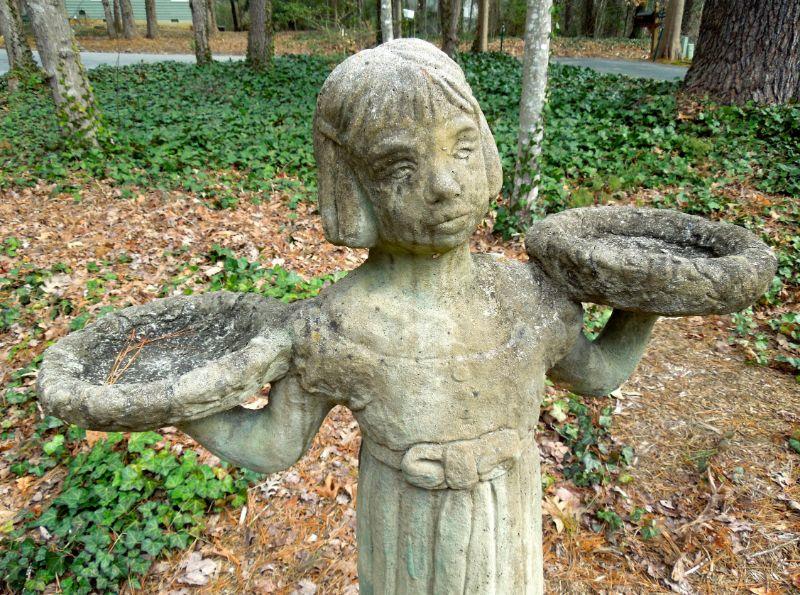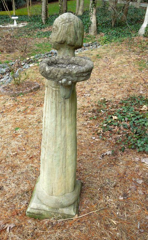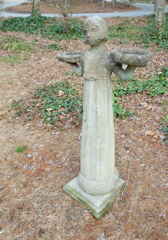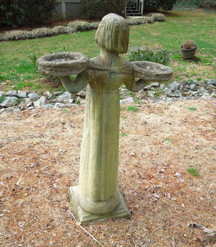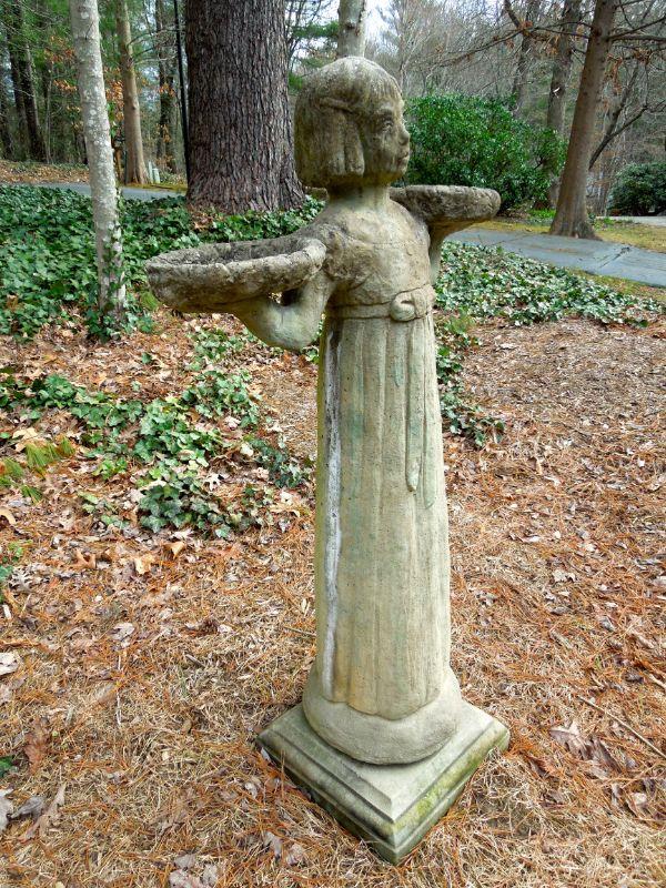 Replica of bronze "Bird Girl" statue sculpted in 1936 by Sylvia Shaw Judson and featured on cover of book Midnight in Garden of Good and Evil based in Savannah, GA. This one is cement and 51" high. the bottom of square base is 15" x 15". She has algae from exposure to elements, but no cracks or chips.