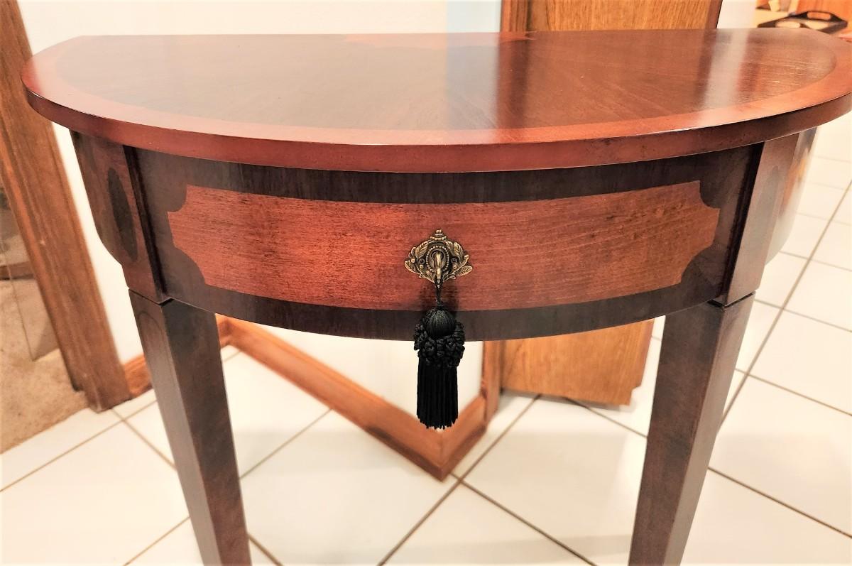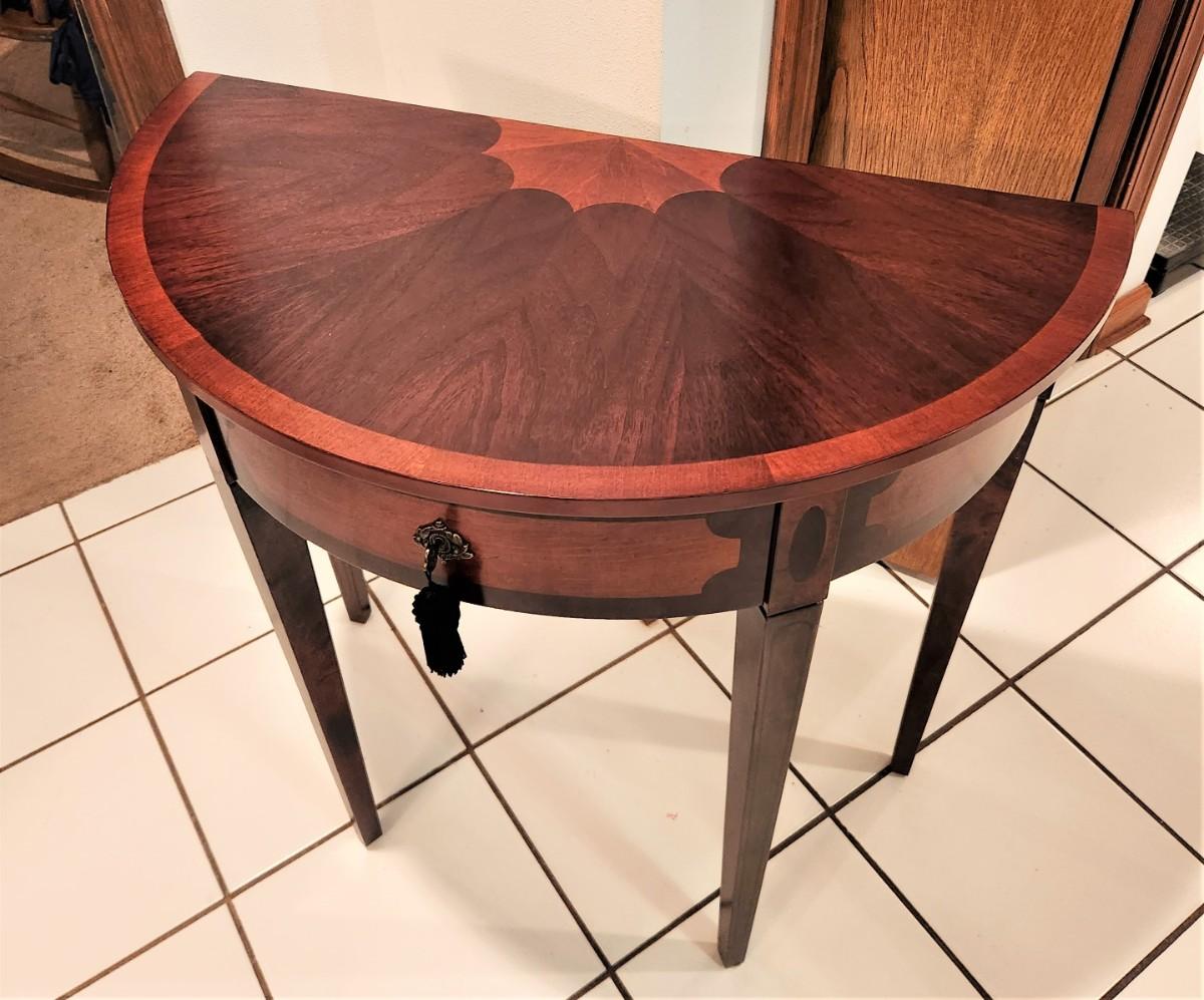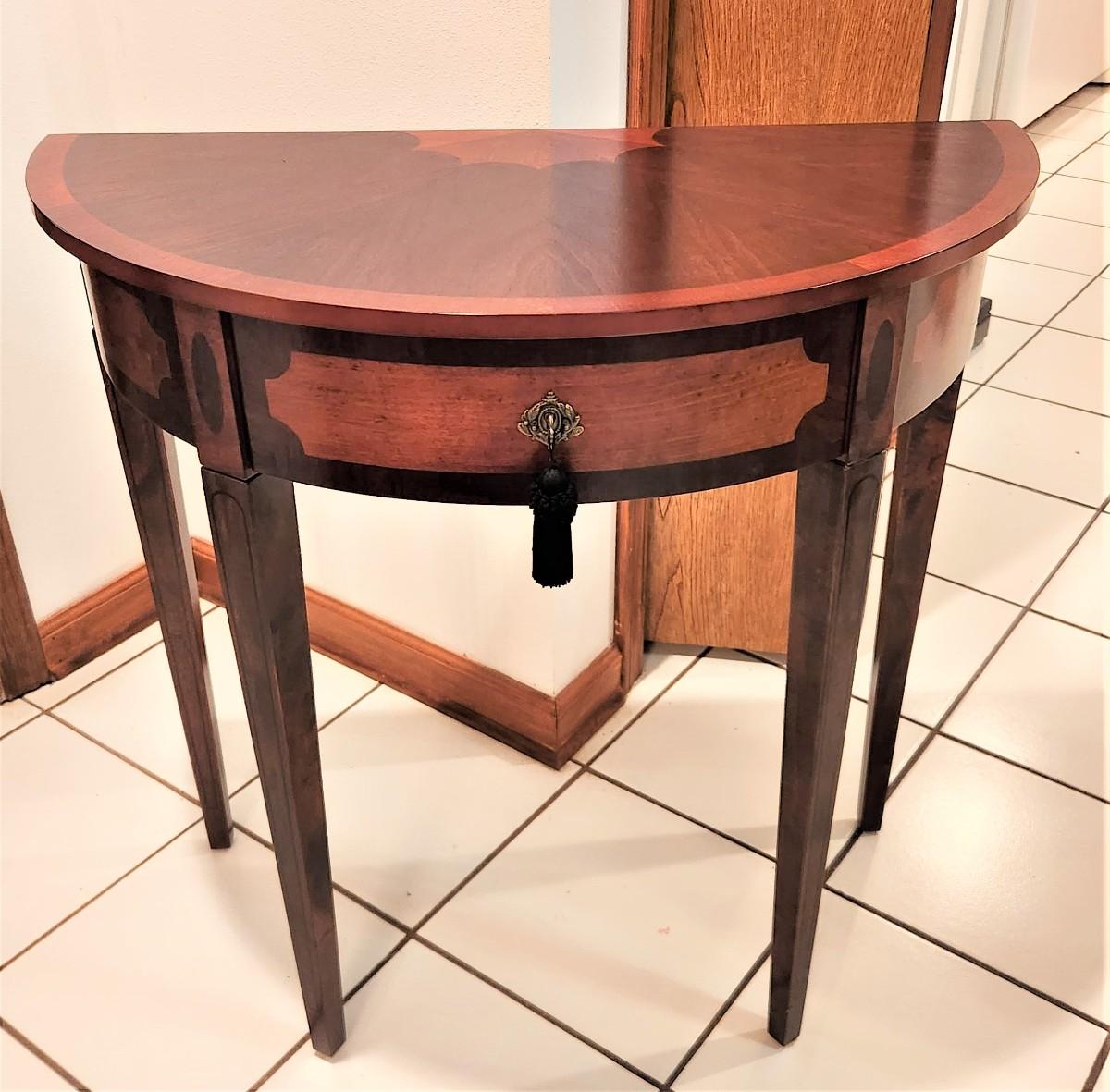 Very nice contemporary decorator demi-lune side table from the Bombay Company with drawer. 31.5" across, 16" deep, 30.5" tall. Good condition.