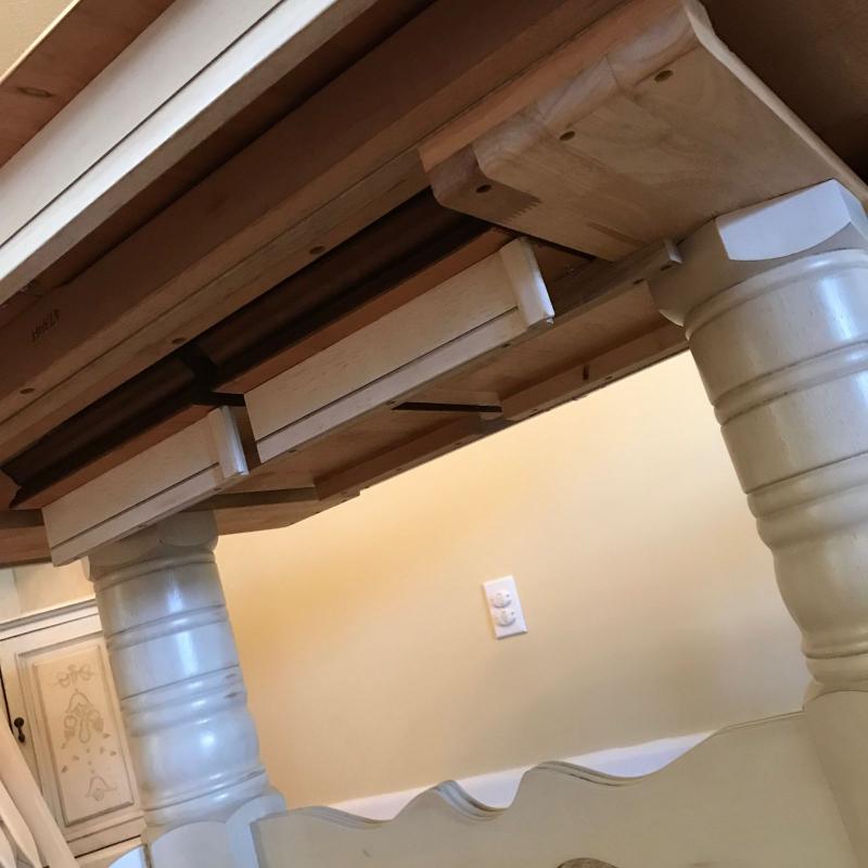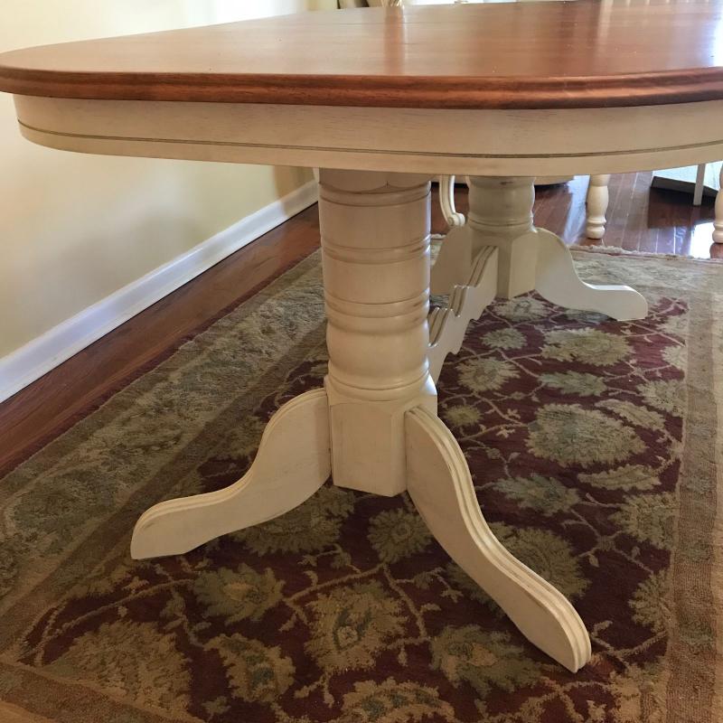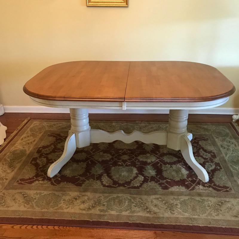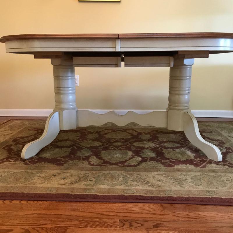 Dining table with two leaves built in. Wooden top with white painted wooden base. Oval measures 60” x 42” x 30”h. Each leaf measures 12” across to add length to the table. No shipping.
