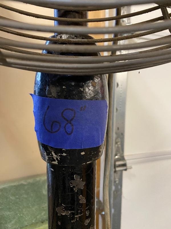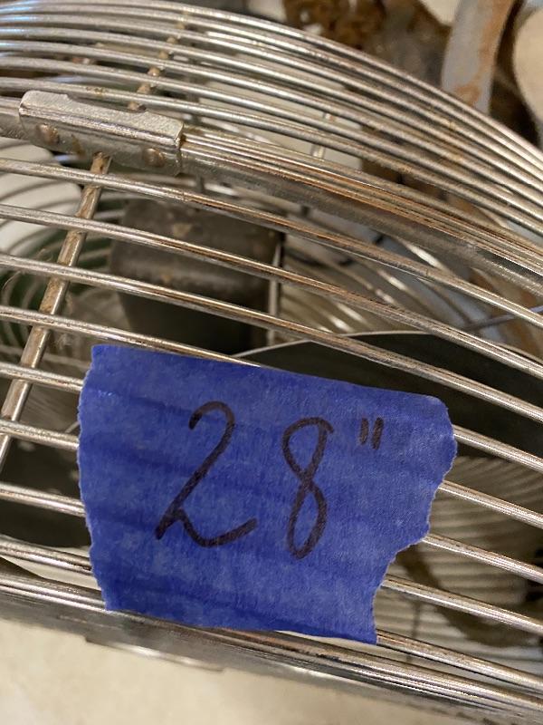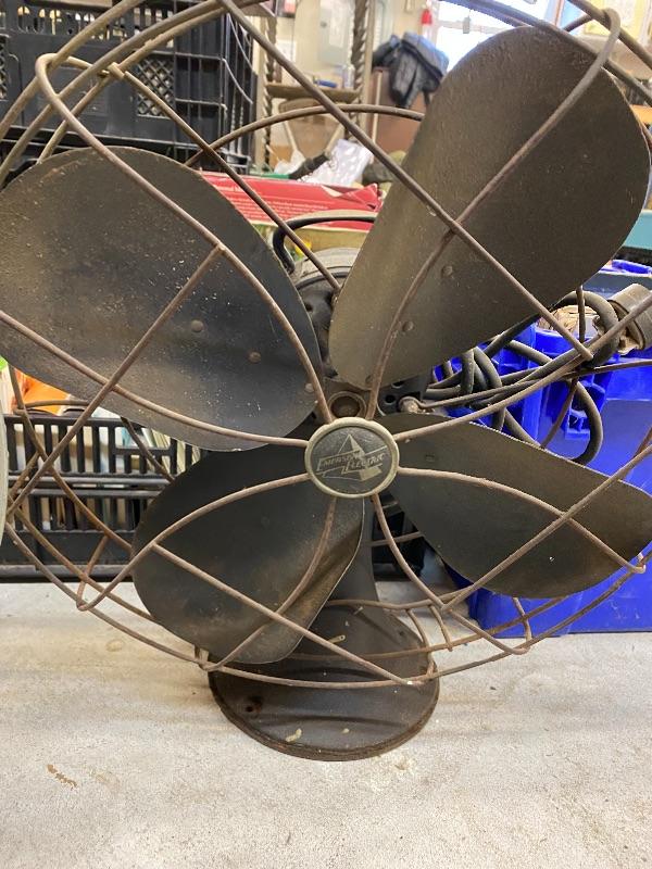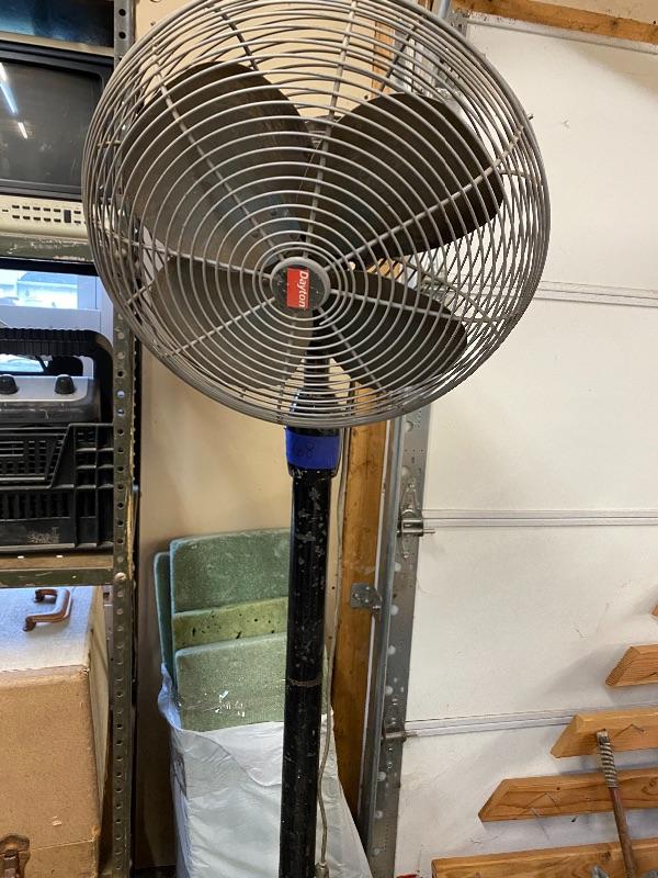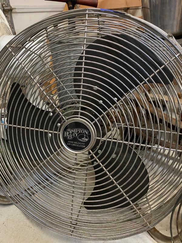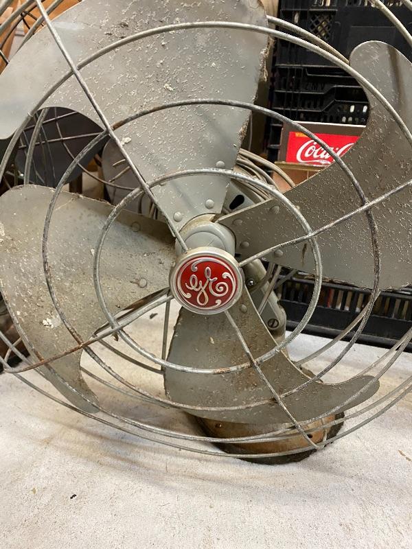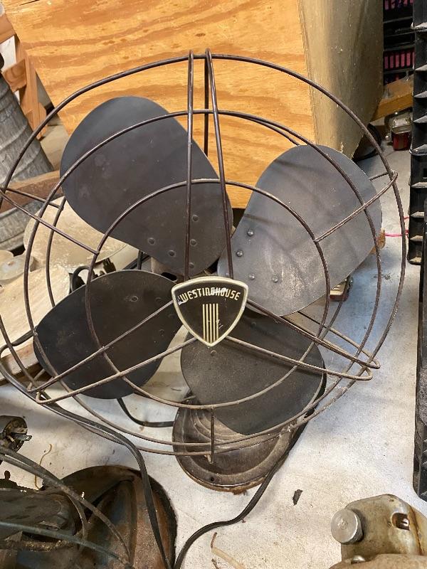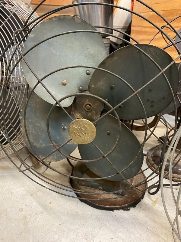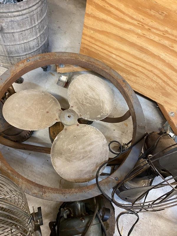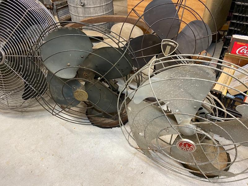 Assorted sized vintage tabletop fans including GE, Westinghouse, MP, Emerson, Hampton Bay 28' floor lamp, and Dayton 68' floor lamp.