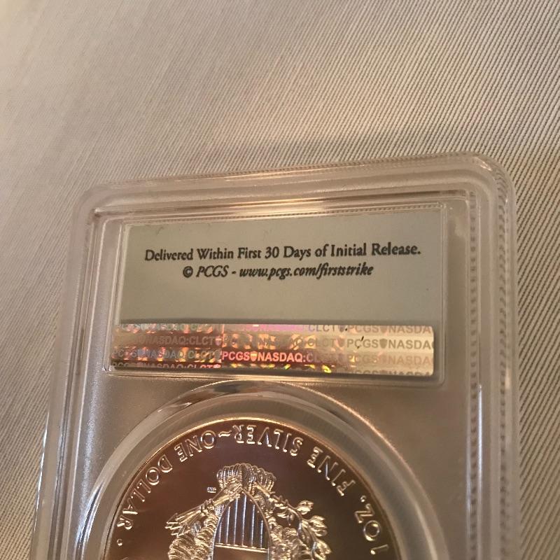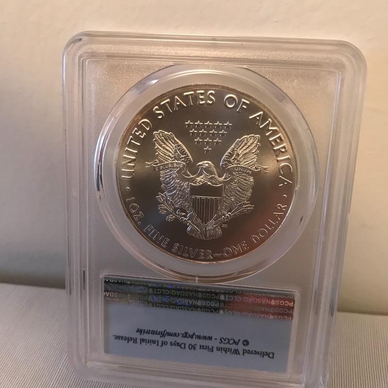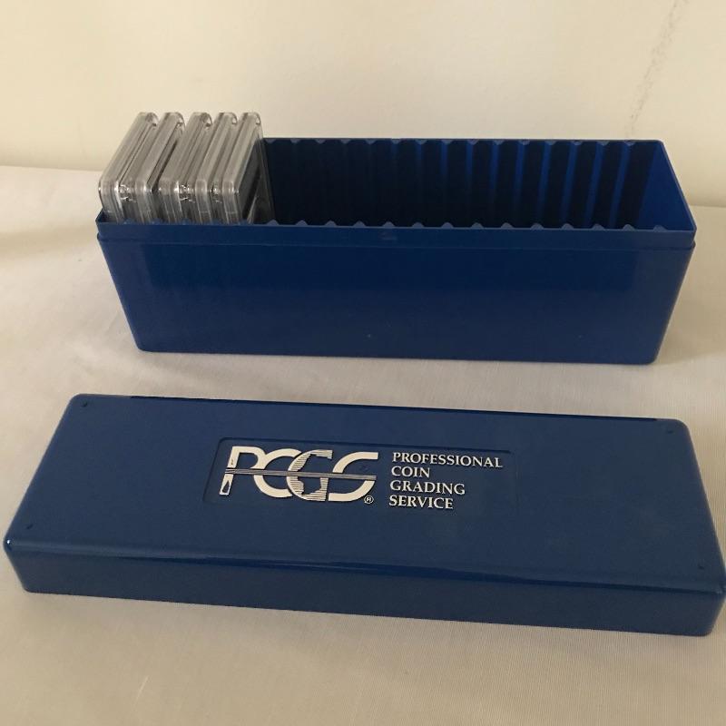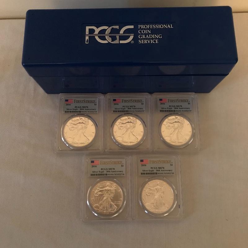 Five 2016 Silver Eagle PCGS certified and graded Mint State one ounce fine silver. Blue plastic PCGS case measures 9” x 2.75” x 3.5” and holds twenty plastic coin cases.
