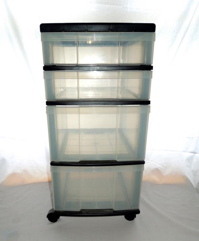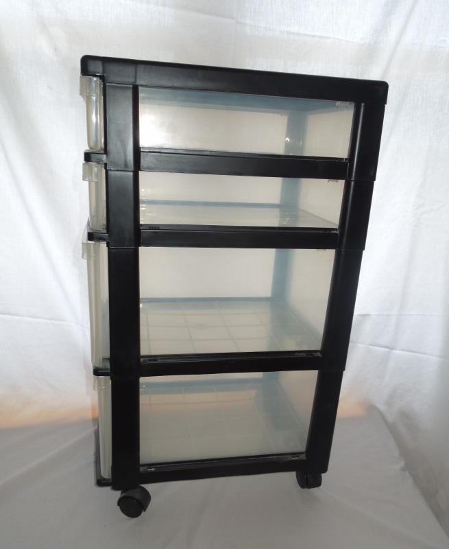 4 drawer plastic storage cart for bath, workshop or office. On plastic caster wheels. Needs wiping down. 27 x 16 x12. No cracks or scratches. One of two being sold separately. See lot # 169.
