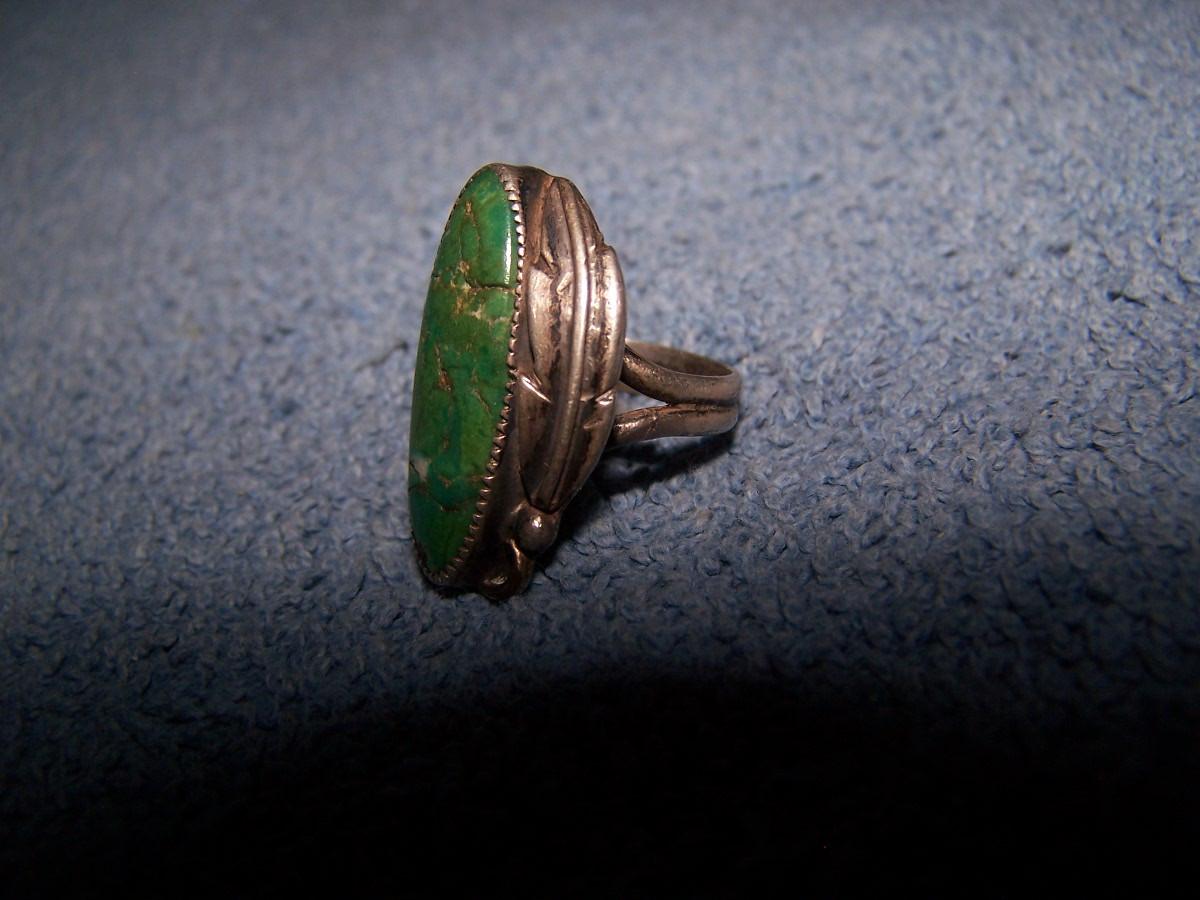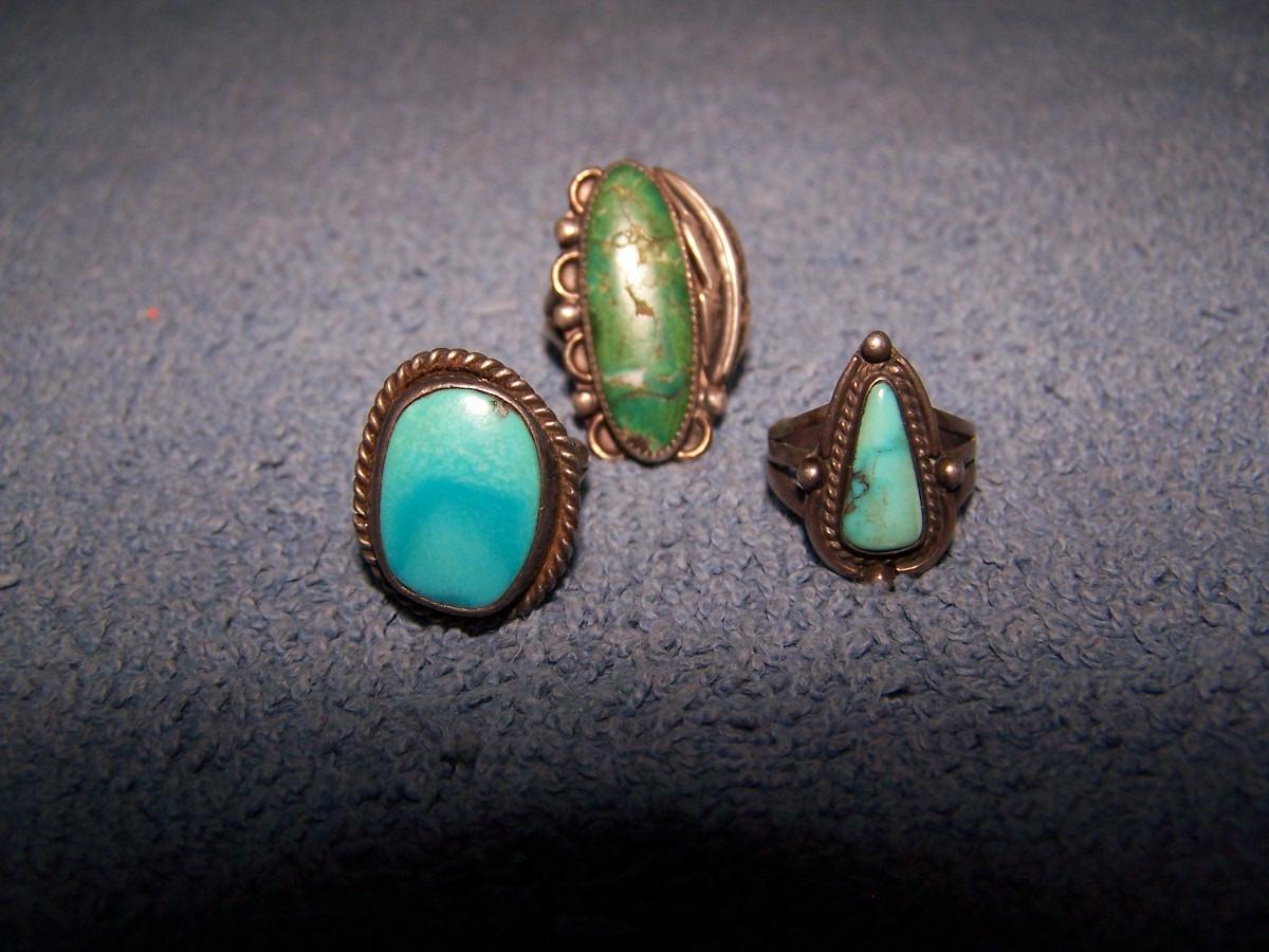 THESE ARE SOME GREAT VINTAGE NATIVE AMERICAN STERLING/TURQUOISE RINGS.. UNMARKED. SIZES APPROX-5, 6 1/4, 6 1/2. LARGE STONE HAS SOME NATURAL CRACKING. 14.98 GR TW. LIGHT WEAR..