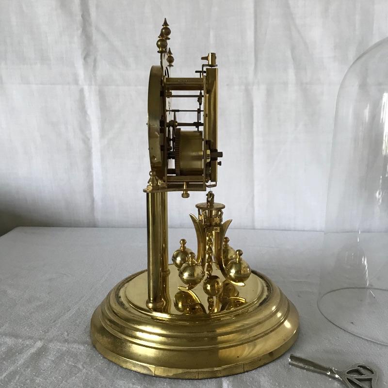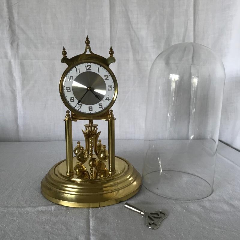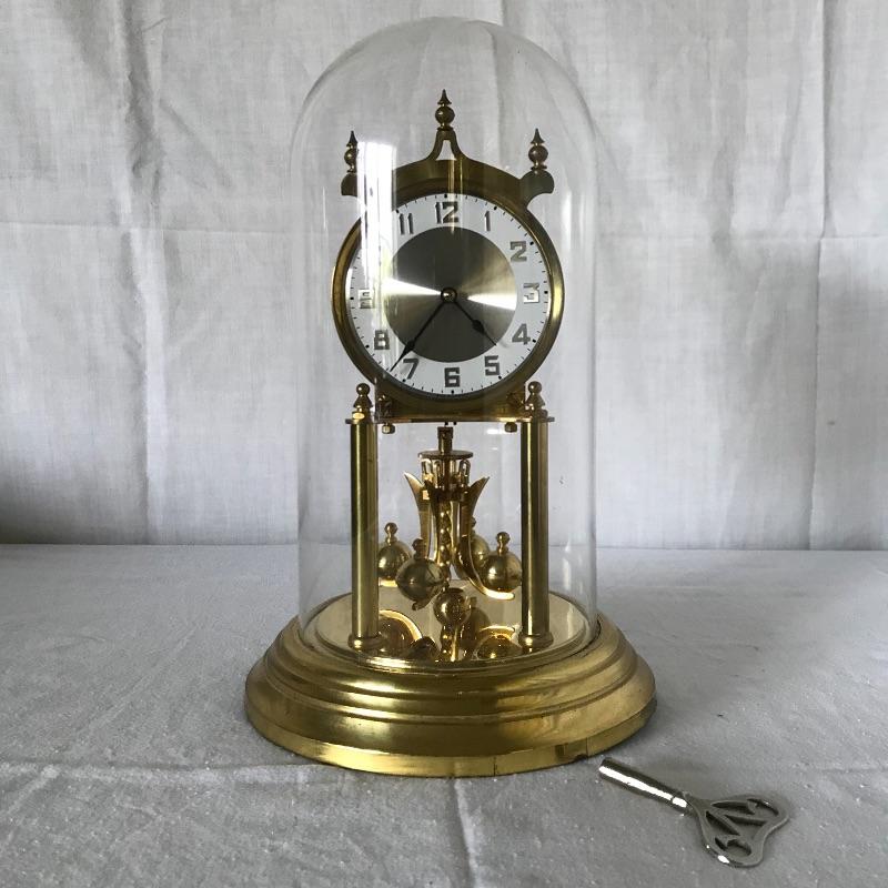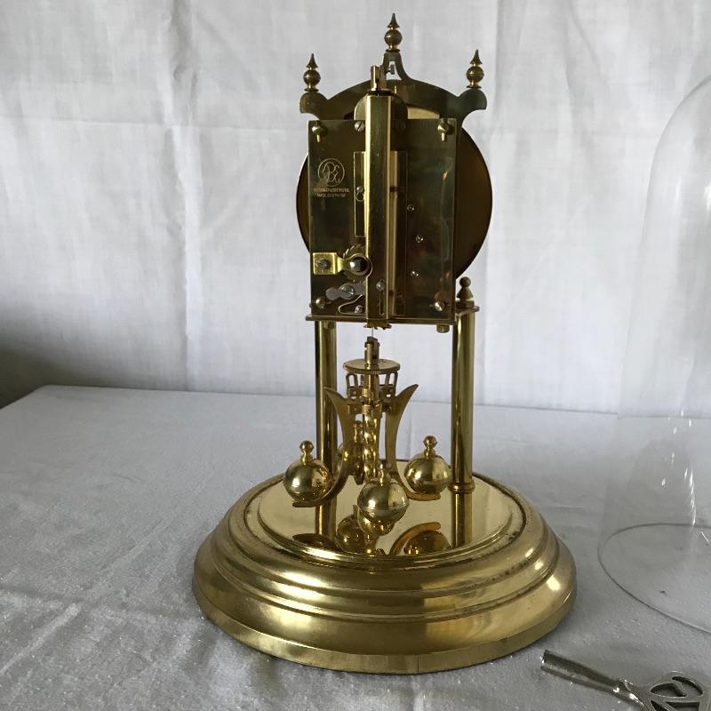 Stunning time piece with glass globe. Piece is marked Kieninger & Obergfell, made in Germany. The key appears to be Pewter and fits the clock, but currently does not wind. It is unclear if a simple tune up will remedy. The glass globe is in fine shape and the clock is 12” tall, stunning all around with a bit of wear to the base. See photos. Shipping available.