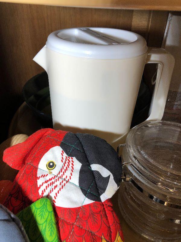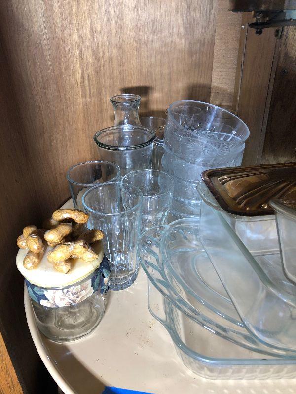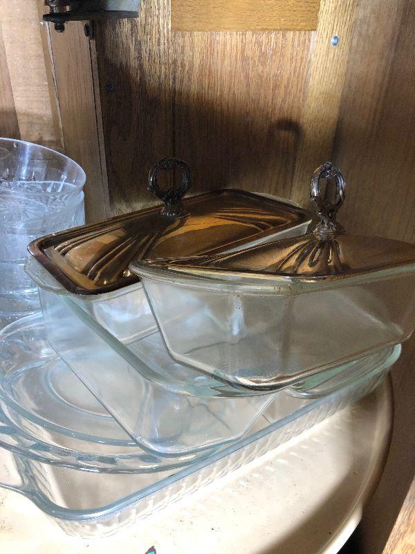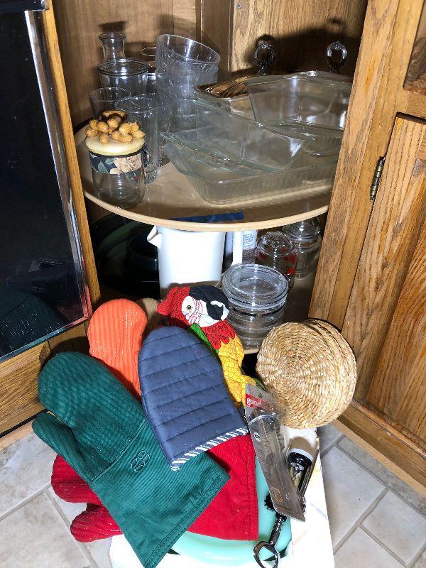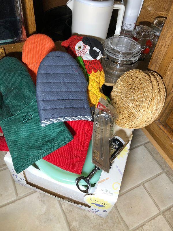Oven mitts, Pyrex, bowls and other miscellaneous items.