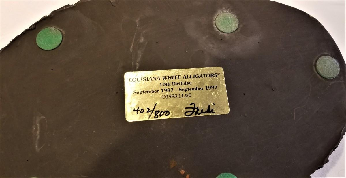 Unusual piece - after 13 years of doing estate sales, this is the first one I've seen. Done in 1997 to commemorate the 10th anniversary of 18 blue-eyed leucistic alligators born on LL&E's property - the only known ones in the world. In 2001, 14 were still alive. When LL&E sold out to another company, some of the gators were donated to the Audubon Institute. In 2001, they weren't as cute as they once were - they weighed hundreds of pounds and were 9 to 10.5 fee long! These sculptures were sold by LL&E in 1997 - each was artist signed (can't make out the signature, but it starts with an "F") and numbered. This one is 402/800. Made of resin and acrylic. About 9 inches long and 6 inches wide. Good condition.