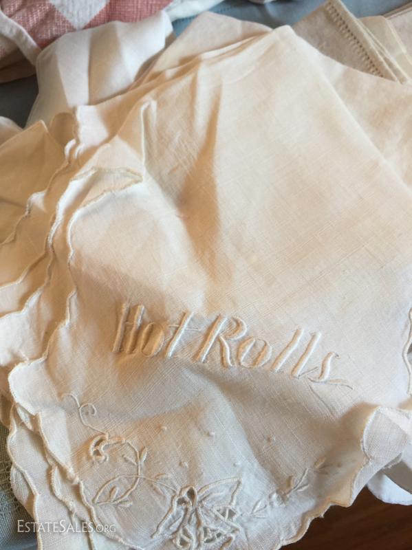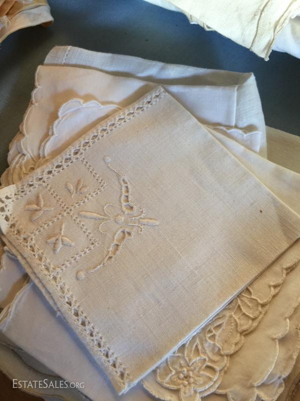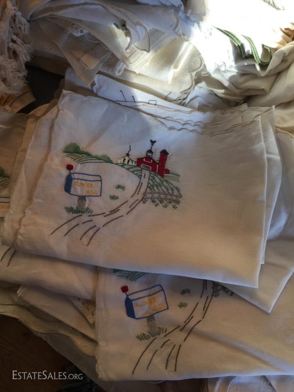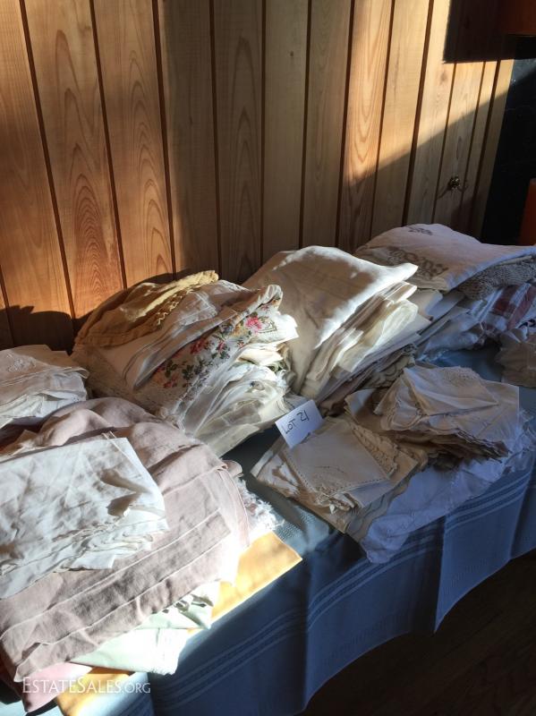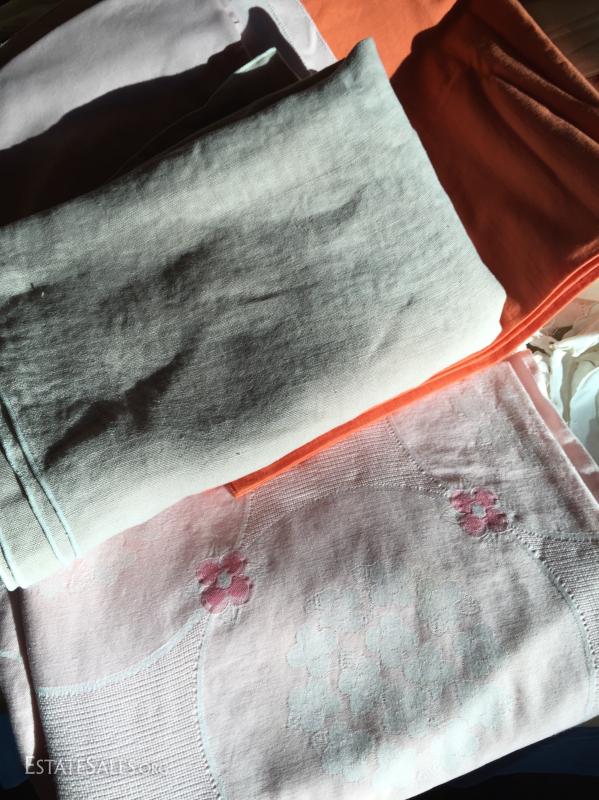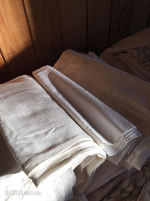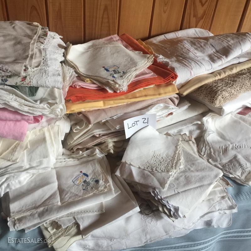 A Large amount of various linen pieces. 30+ tablecloths( various shapes and sizes), napkins, hand towels etc. Variety of styles. Some embroidered. Most are new with little wear. Sold As Is.