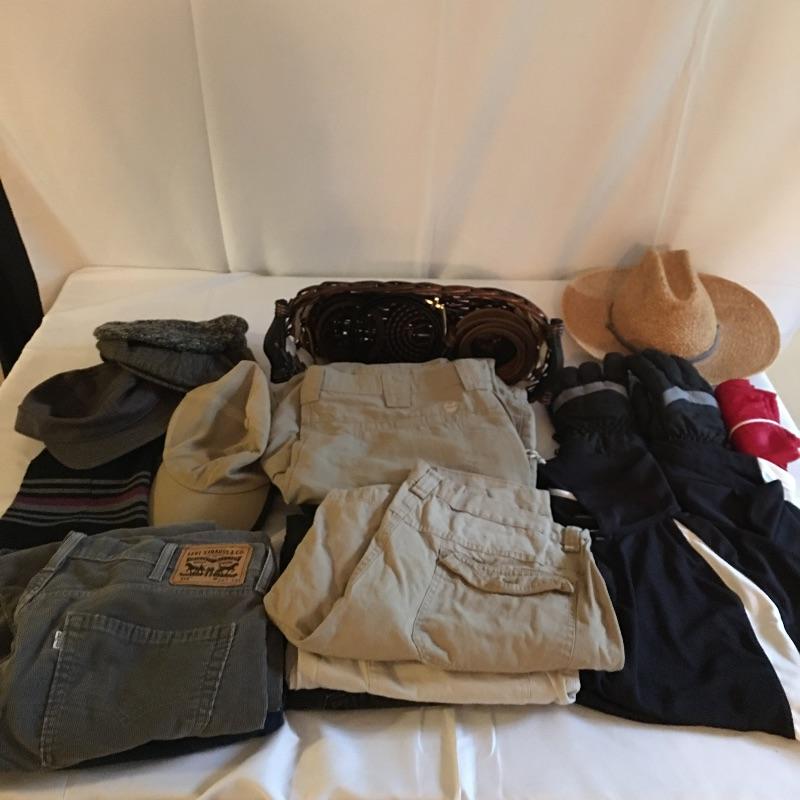 A nice collection of men’s fashion includes five belts size 40, cowboy hat, caps and toques, gloves, Shorts by Eddie Bauer, Canyon Guide, Wranglers and more. Also includes Under Armour and Nike sport shirt and Levi’s corduroy’s and Wrangler jeans. Men’s shorts and pants are sized 38 and shirts are large.