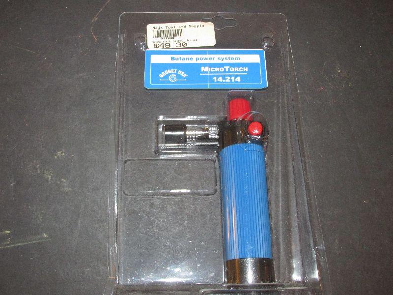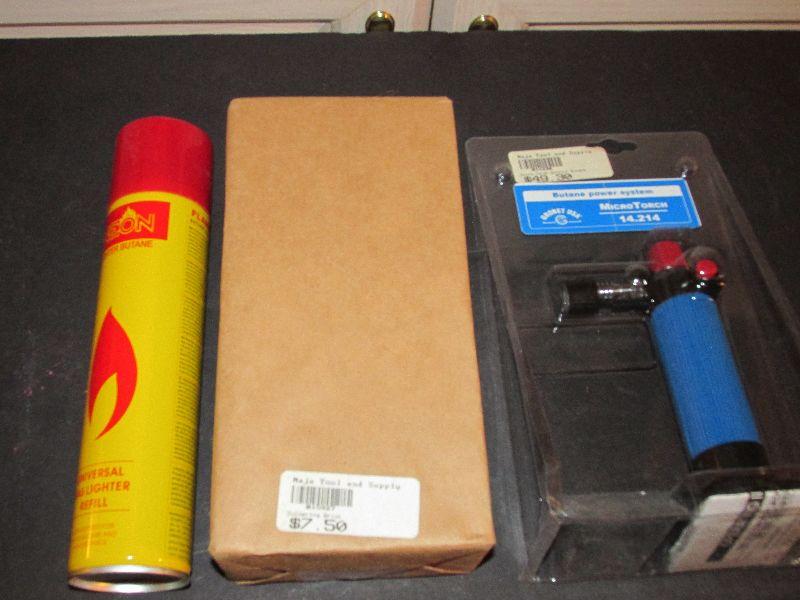 Collection of Micro Torch, soldering brick from Naja Tool & Supply, and a can of butane. Micro Torch and soldering brick are brand new in package.
