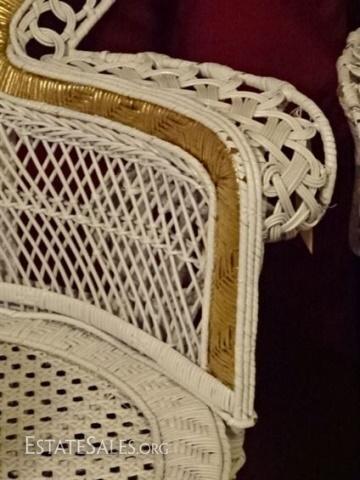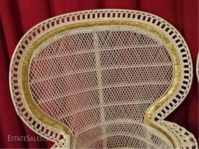 LOT 21: PAIR GILT AND WHITE WICKER PEACOCK ARMCHAIRS, WHITE ENAMEL FINISH WITH GILT GOLD ACCENT STRIPE, VERY GOOD VINTAGE CONDITION WITH SOME LOSS OF FINISH IN SPOTS, 54" X 40" X 20", SKU387.44