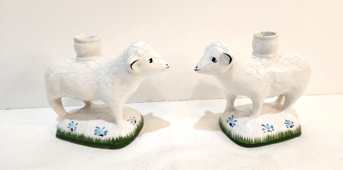Whimsical pair of candlesticks in the form of lambs, hand painted - made in Portugal, 5.5" tall, 7" long.. Stylized crazing.