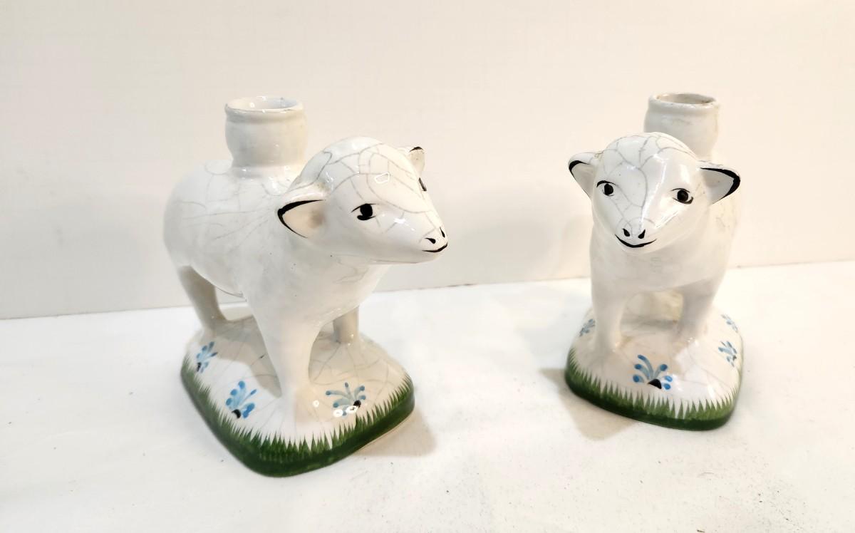 Lot #21 Pair Hand Painted Portugal Cendlesticks - Lambs