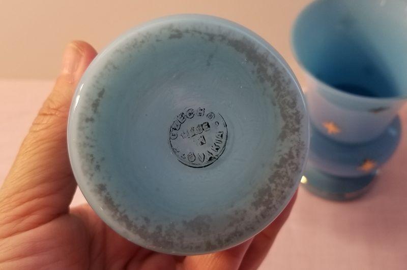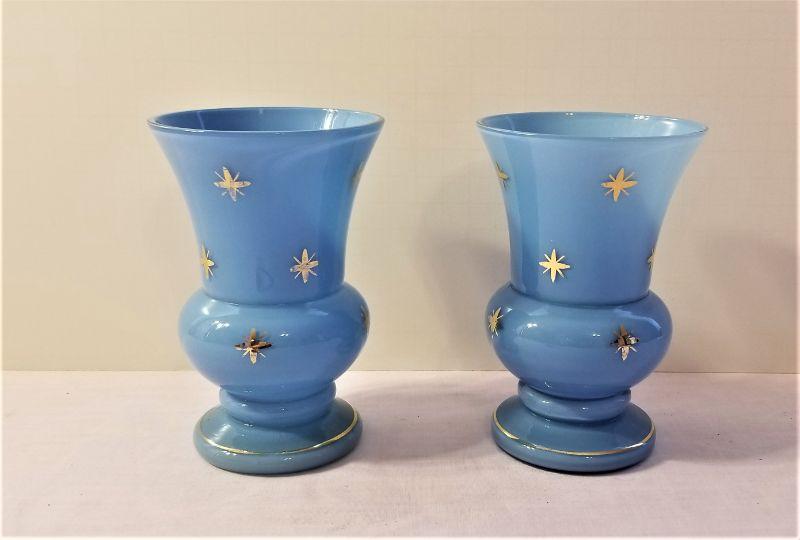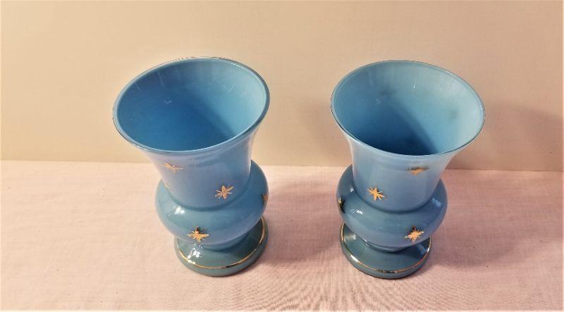 Sweet pair of antique hand-blown CZECH (marked) vases. Each measure 5.25" tall - robin's egg blue in color with gold "star" decoration. Both in good antique condition.