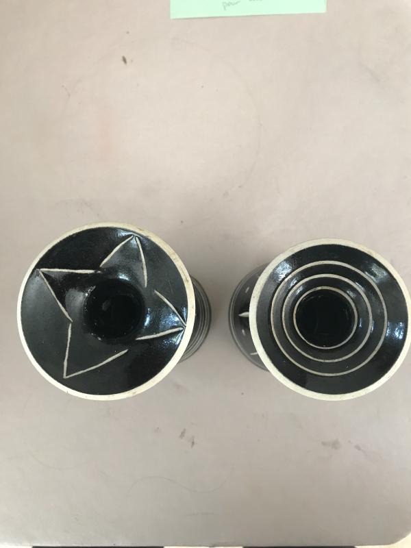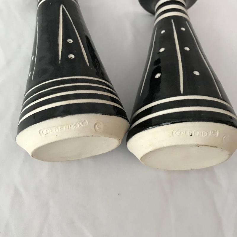Super cool MCM black clay statement vases signed Goldenberg. Approx. 3.5”x7.75”. Shipping available