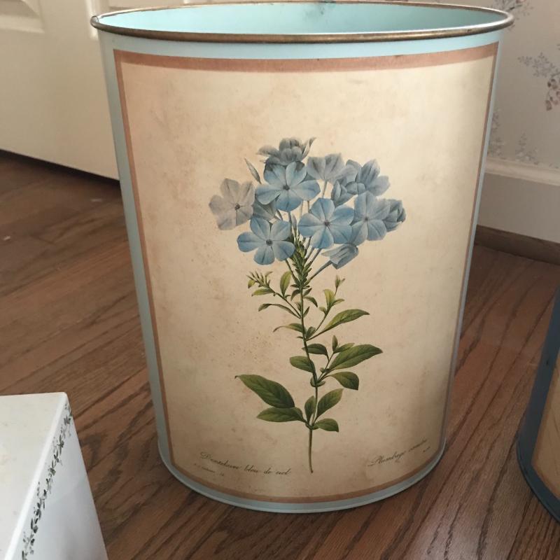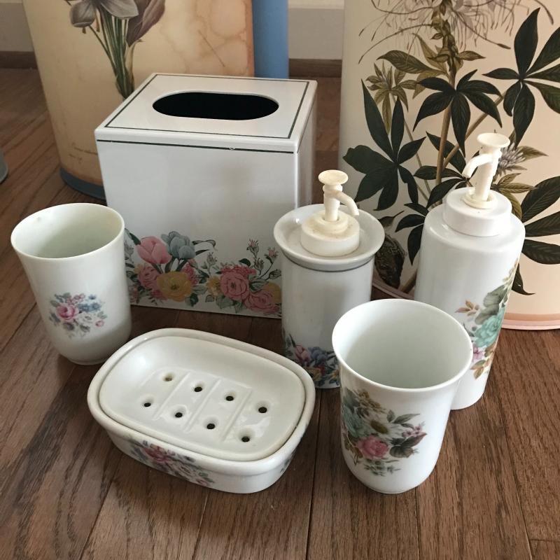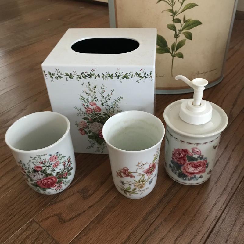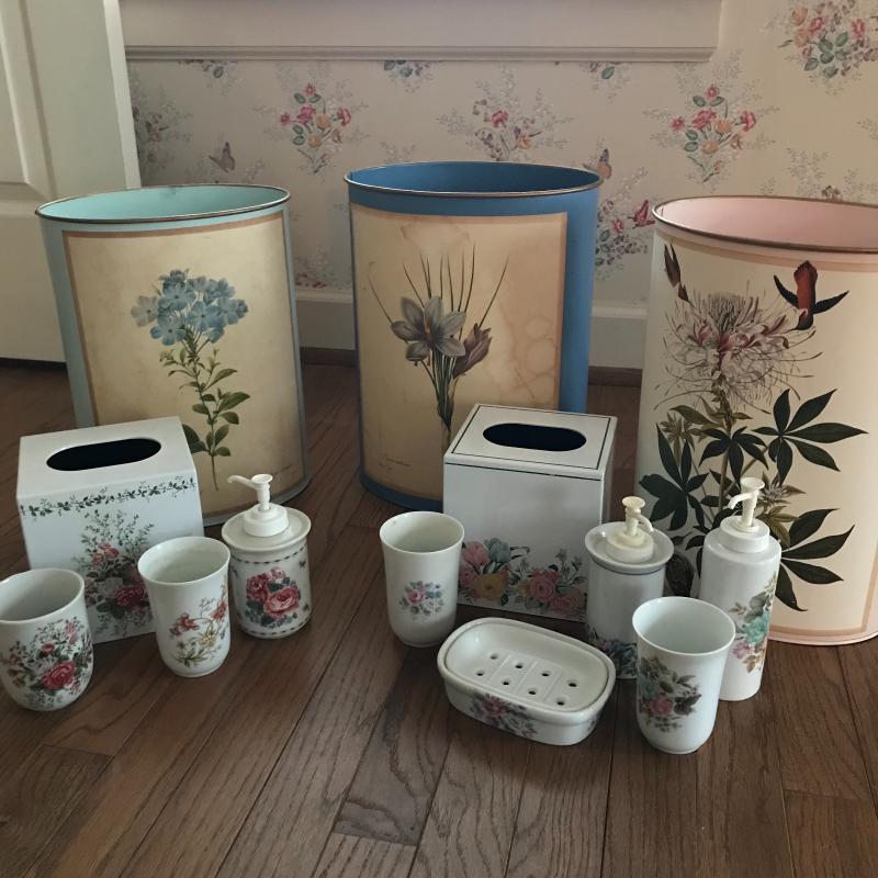 This lot contains enough items for three bathrooms. Includes three metal trash cans (approx. 13” tall), two plastic tissue box covers, three ceramic soap dispensers, one ceramic soap dish, and four ceramic cups. Shipping available or local pickup in Flatrock, NC.