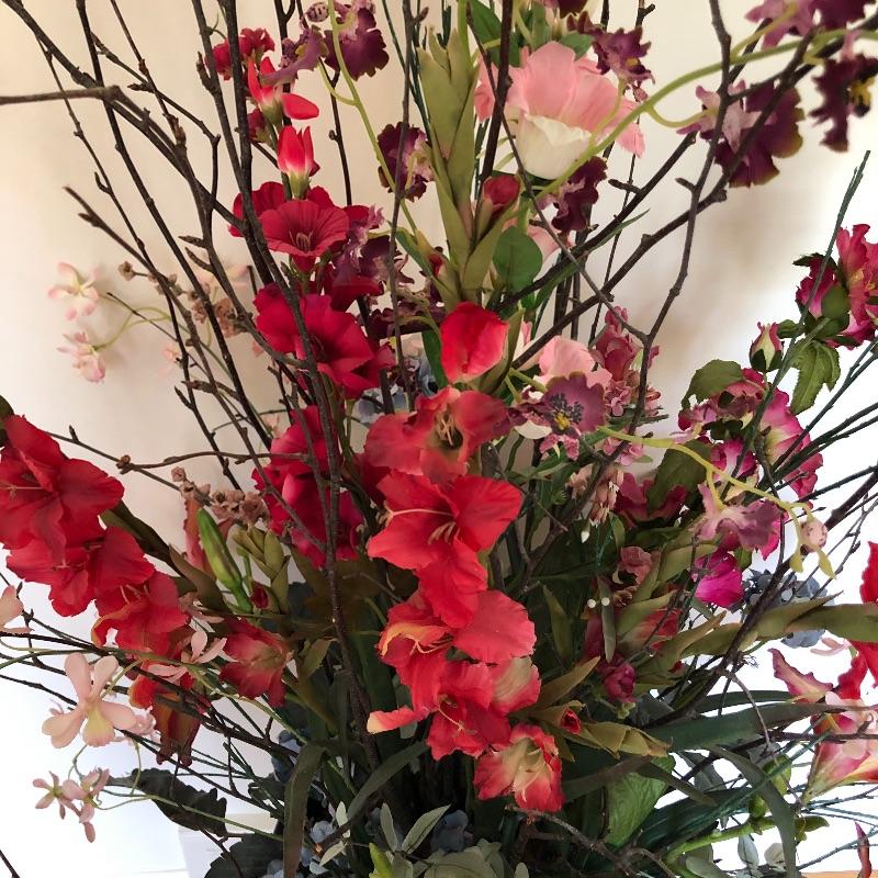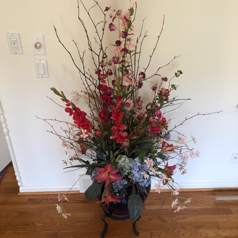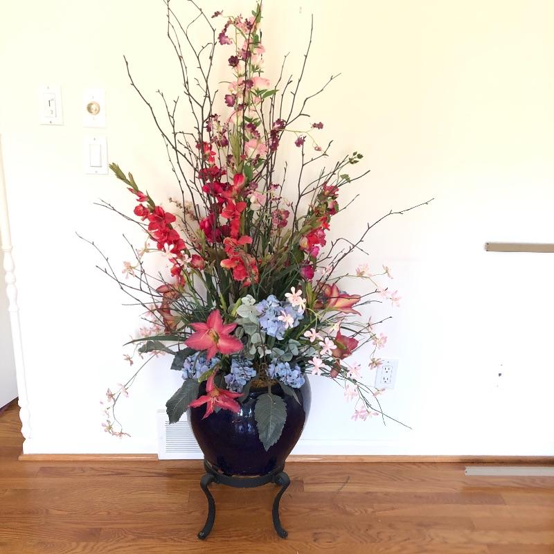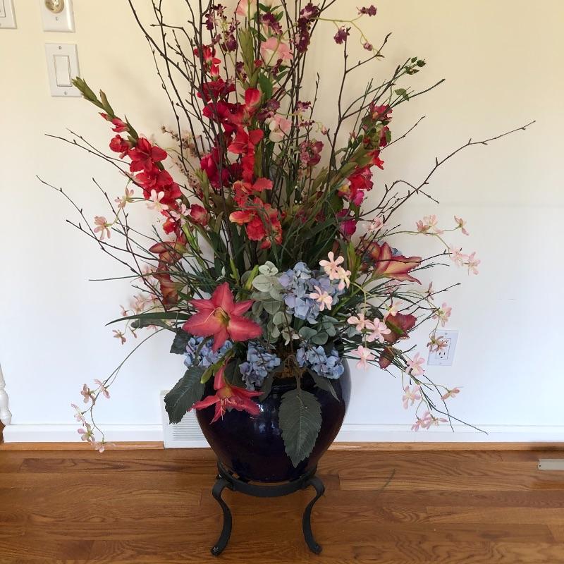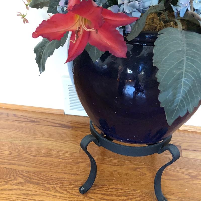This planter with faux floral will be a focal point in your home decor.! Beautiful summer faux flowers are arranged in a dark plum ceramic planter that measures 12” tall that sits atop a 9” tall black metal stand.