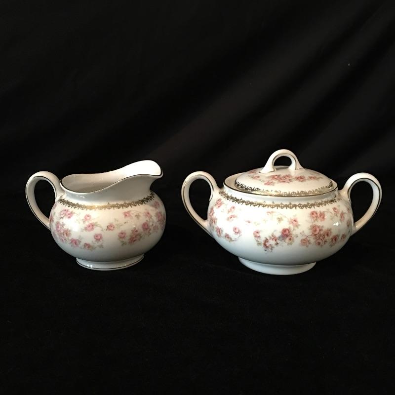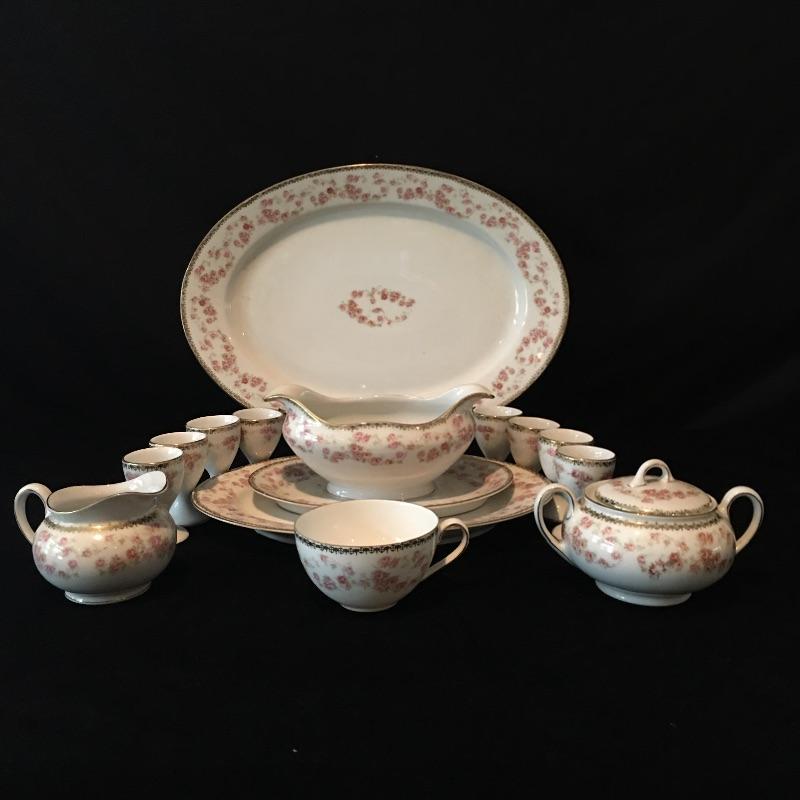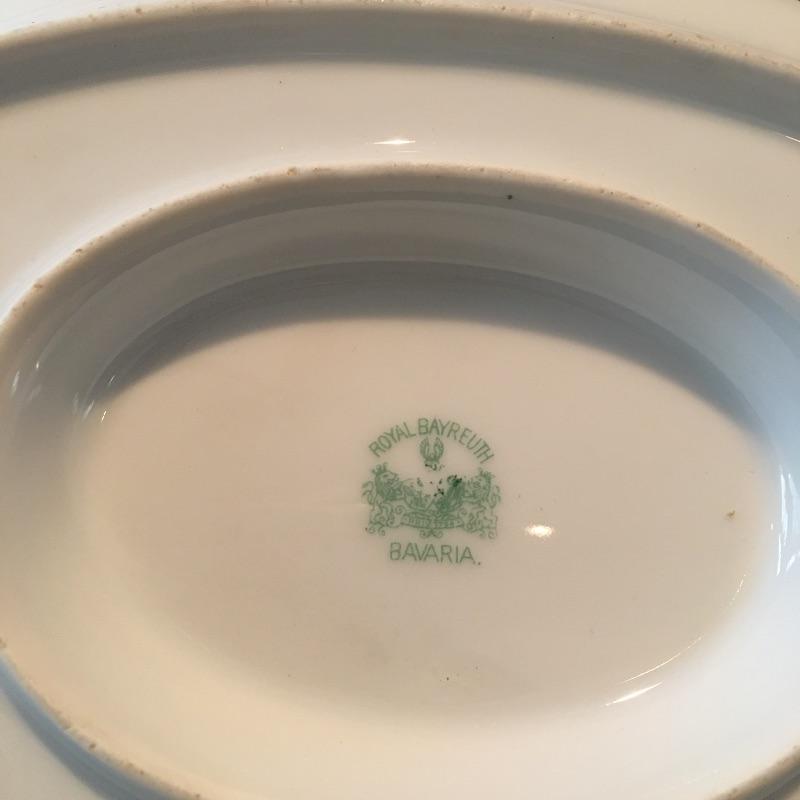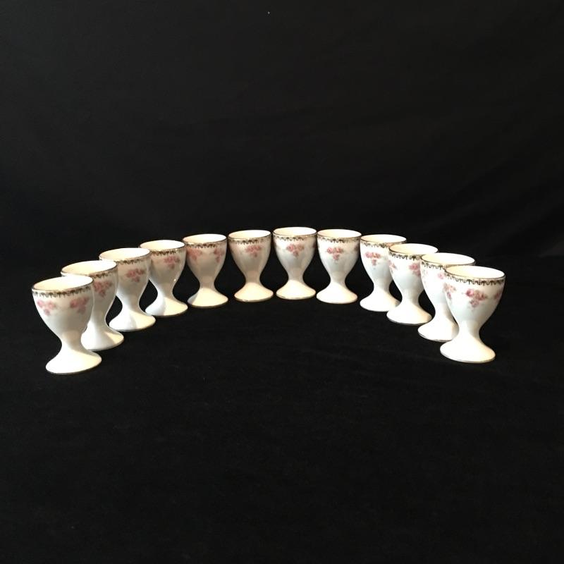 Royal Bayreuth Bavarian China array includes twelve egg cups, gravy boat, sugar bowl, creamer, tea cup, small platter and a large platter that measures 11.75” x 16”.