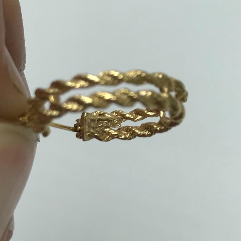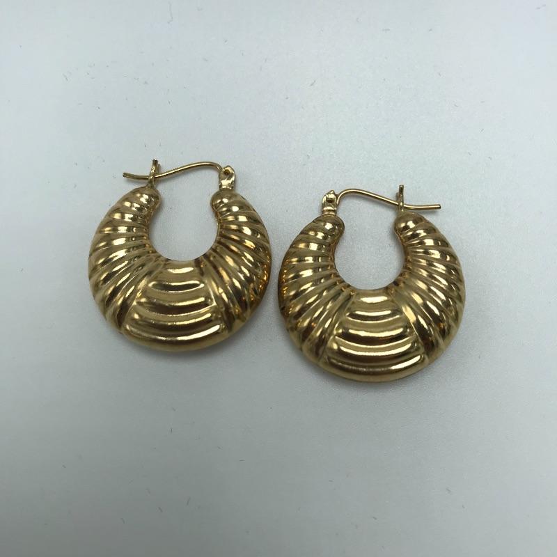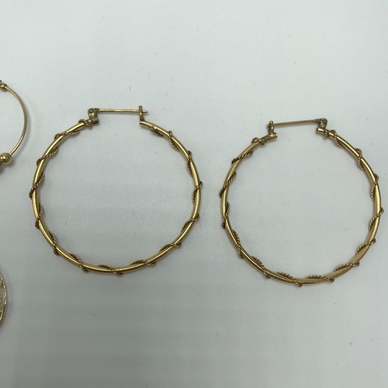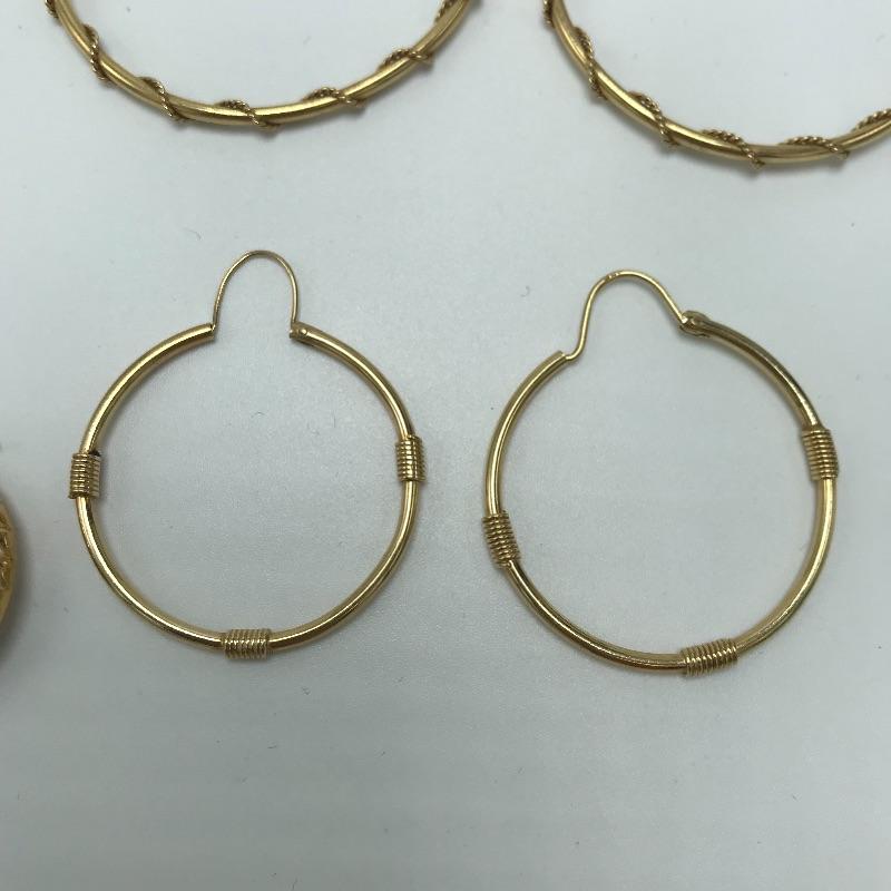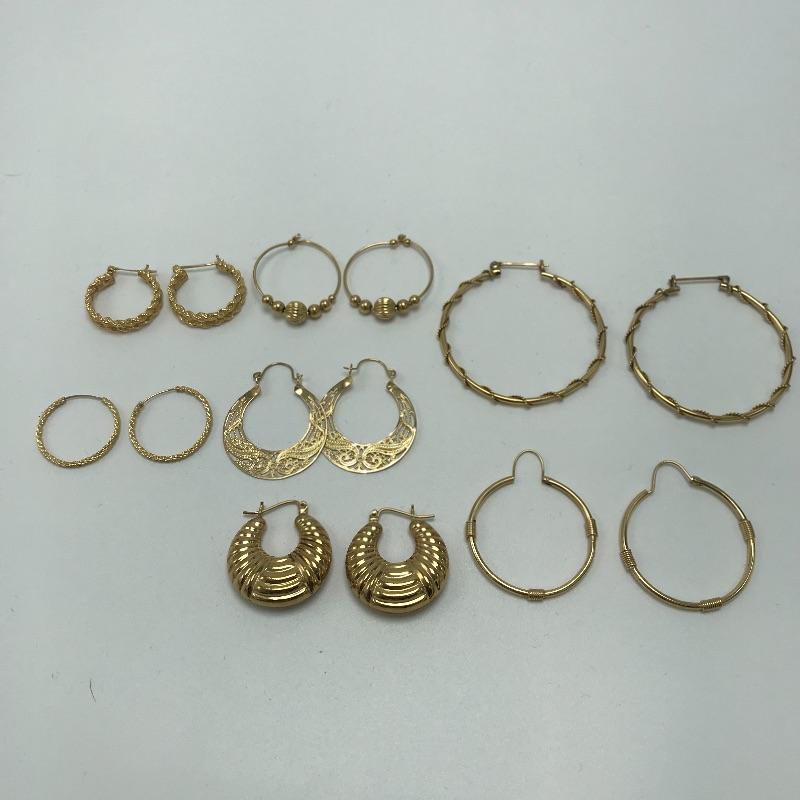 Wear a different pair every day of the week! Seven fashionable hoop earrings all golden for your fashion needs. One chunk pair appears to be marked 10K, the earrings are lighter than they look, possibly hollow.