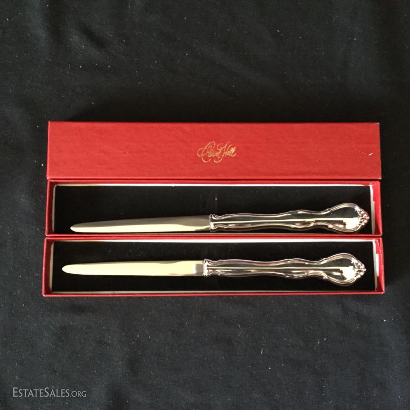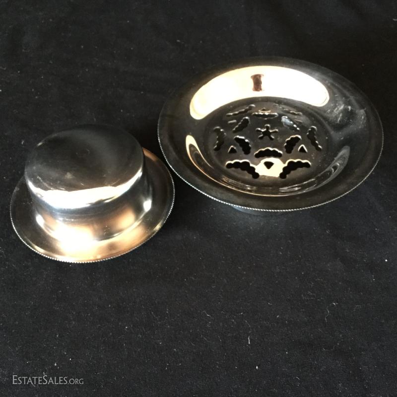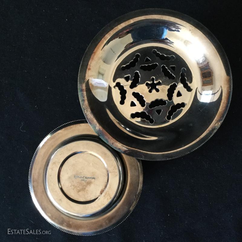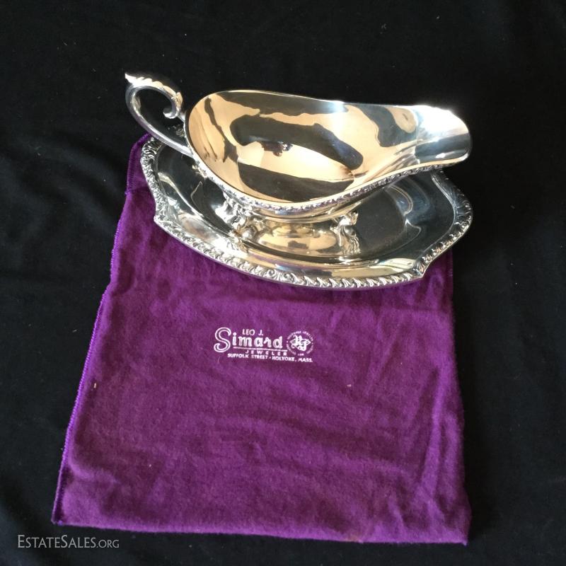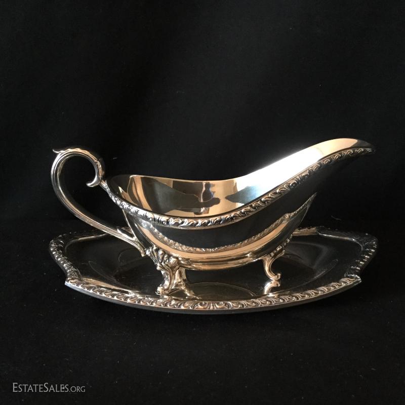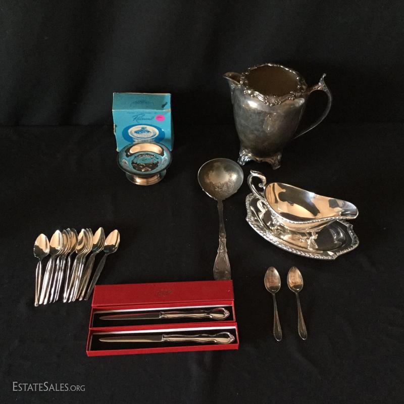 Silver plated serving pieces for entertaining. Wickford gravy dish and tray. Grapefruit spoons. Pitcher is silver on copper 8"h. Serving spoon. Raimond butter dish. Two new-in-box letter openers by Carvel Hall. Great gift! See photos.