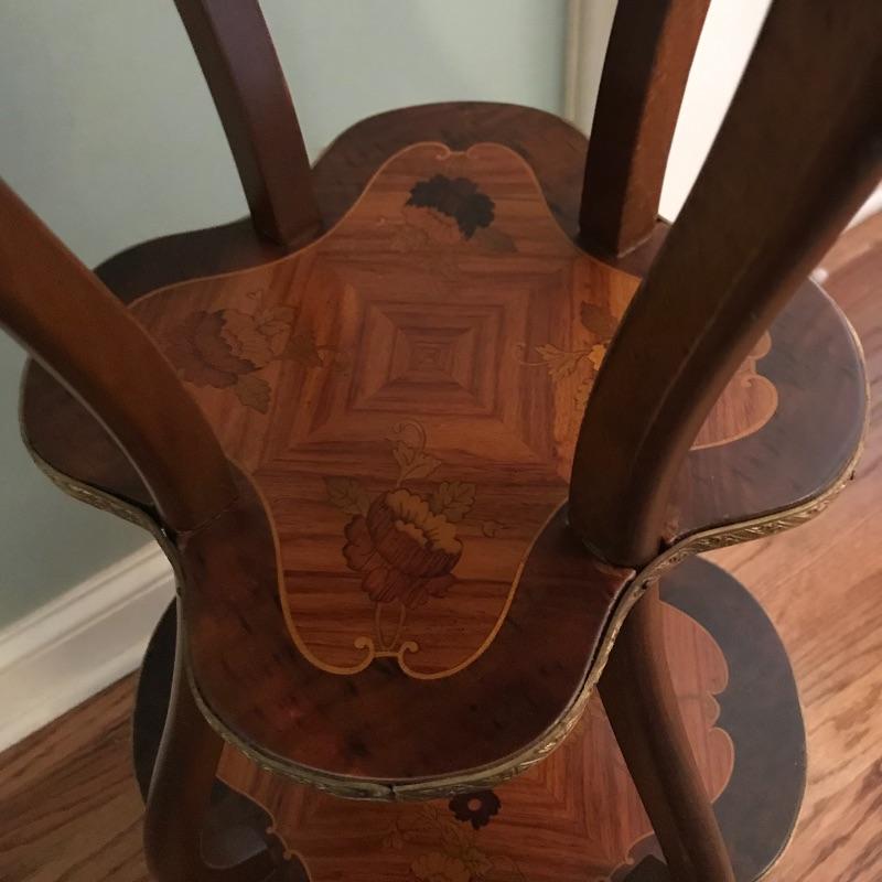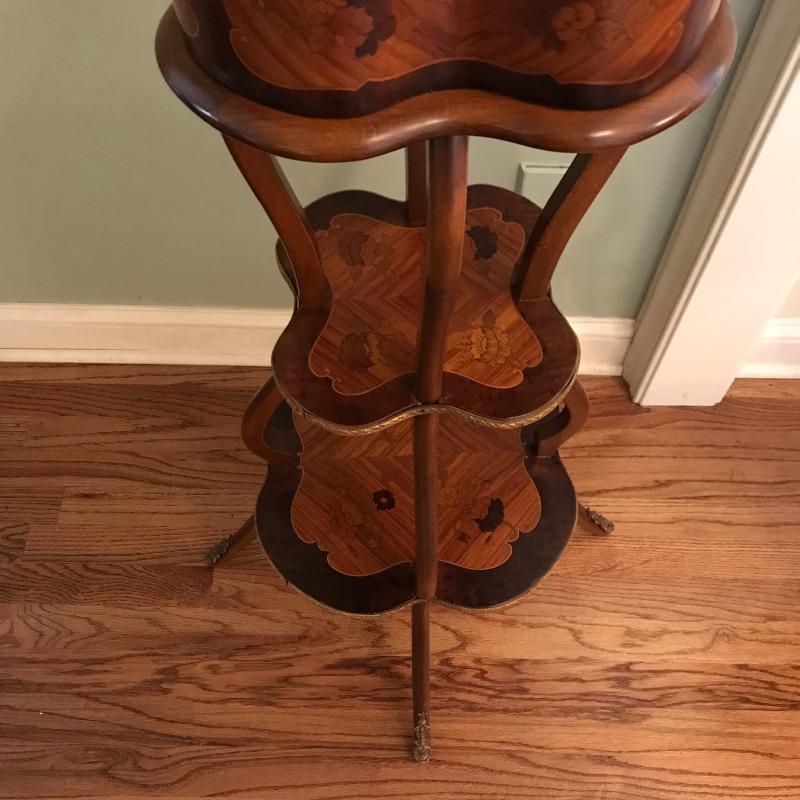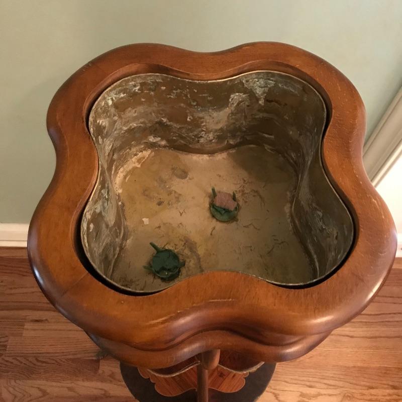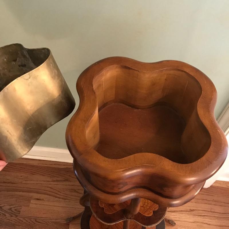 One of many jaw-droppers in this sale. Three tiered plant stand with inlaid designs on all faces. Brass bordered the bottom two tiers and all four legs. There is also a custom fit brass liner to protect the top from water damage. See photos! Piece is approximately 16”sq at base and 39” high. No shipping.