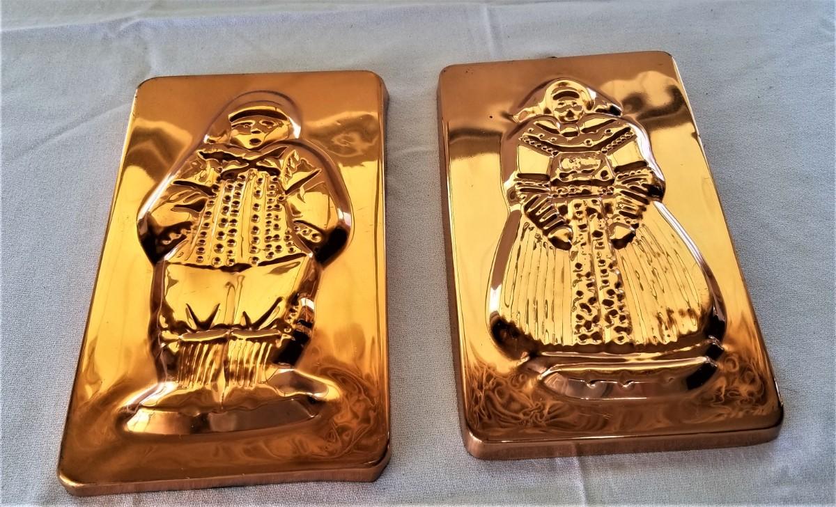 Sweet pair of copper molds - two out of an extensive collection we will be featuring in the sale - Man/woman european couple. The each measure 5.75" x 10". Good condition.