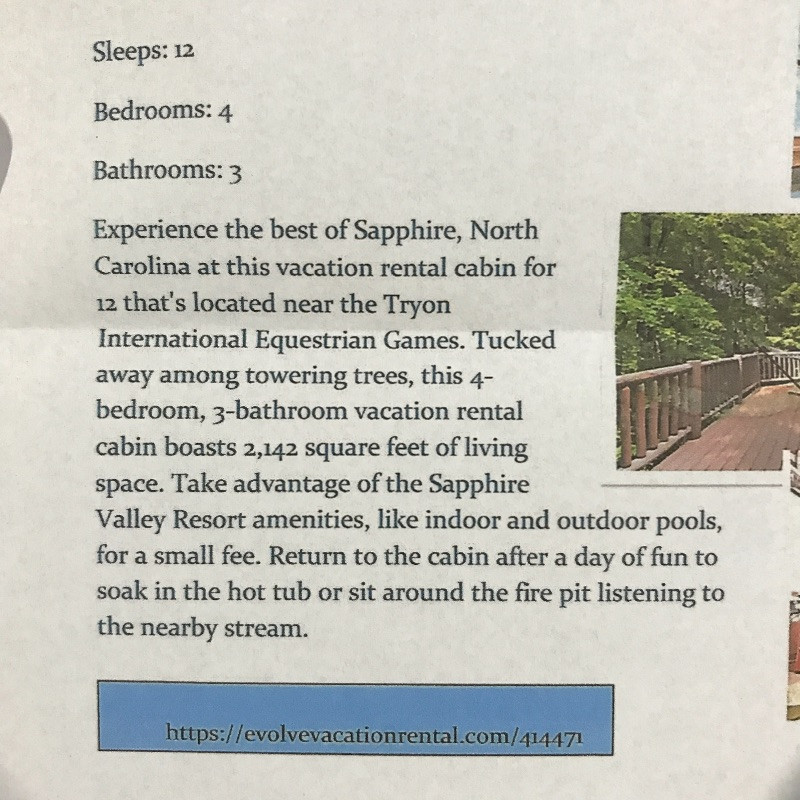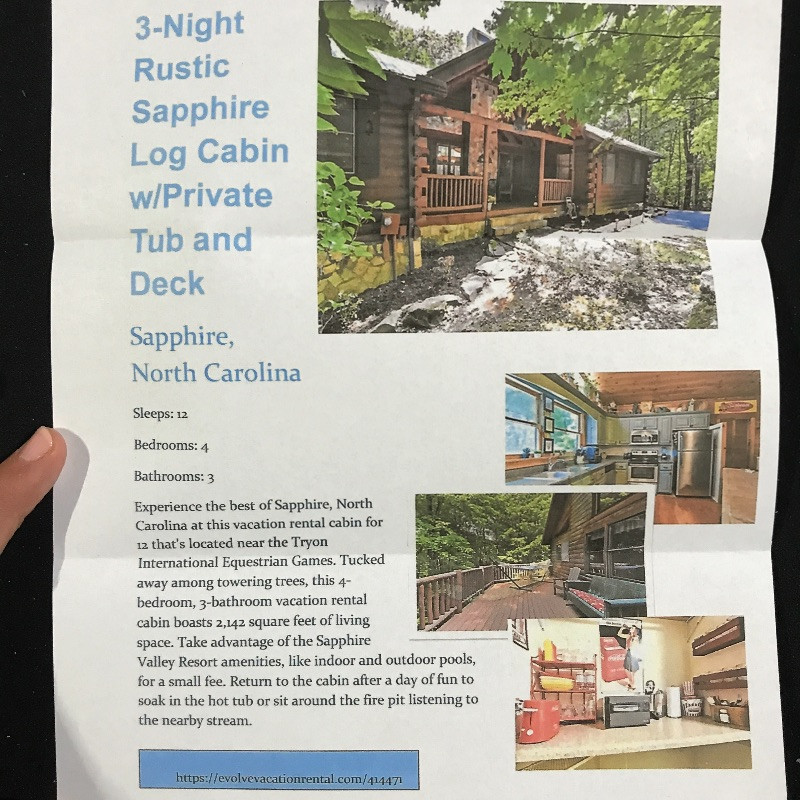 Bring all the family and your friends for a 3 night getaway that won't take long to get to with this rustic log cabin in Sapphire, which is near the Tryon Equestrian Center. Tucked in the woods this 4 bedroom 3 bath home is over 2100 sq ft and sleeps 12. See images for more information and you can read the description on their vacation rental website at https://evolvevacationrental.com/414471.