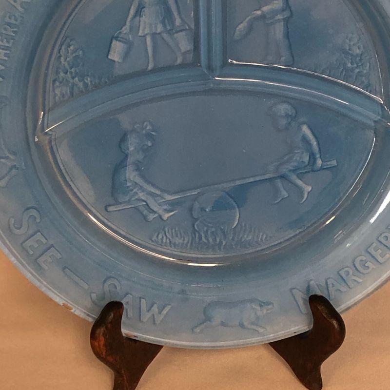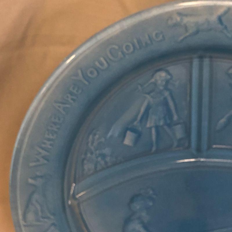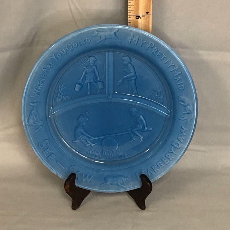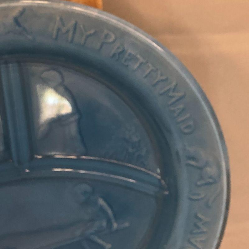 This plate appears to have had a coating added to the back to give it a milky blue finish. I don't know if this is from the manufacturer or a later addition. It is in very good condition and measures 8.5" in diameter.