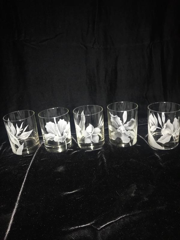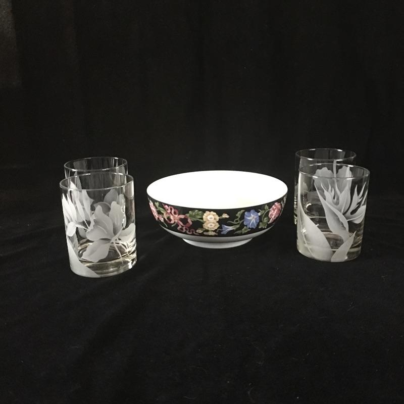Tiffany and Co. vegetable bowl Merrion Square by Sybil Connolly and five etched glasses. Tiffany bowl measures 7.5” D.