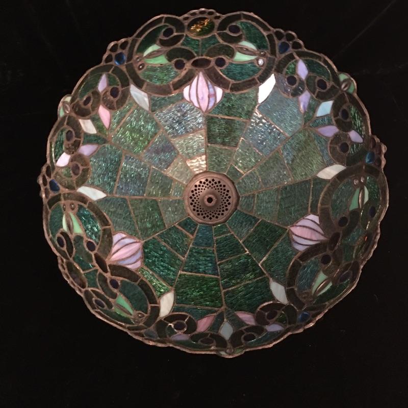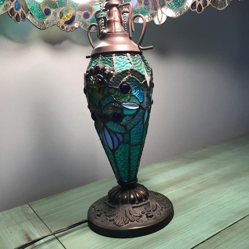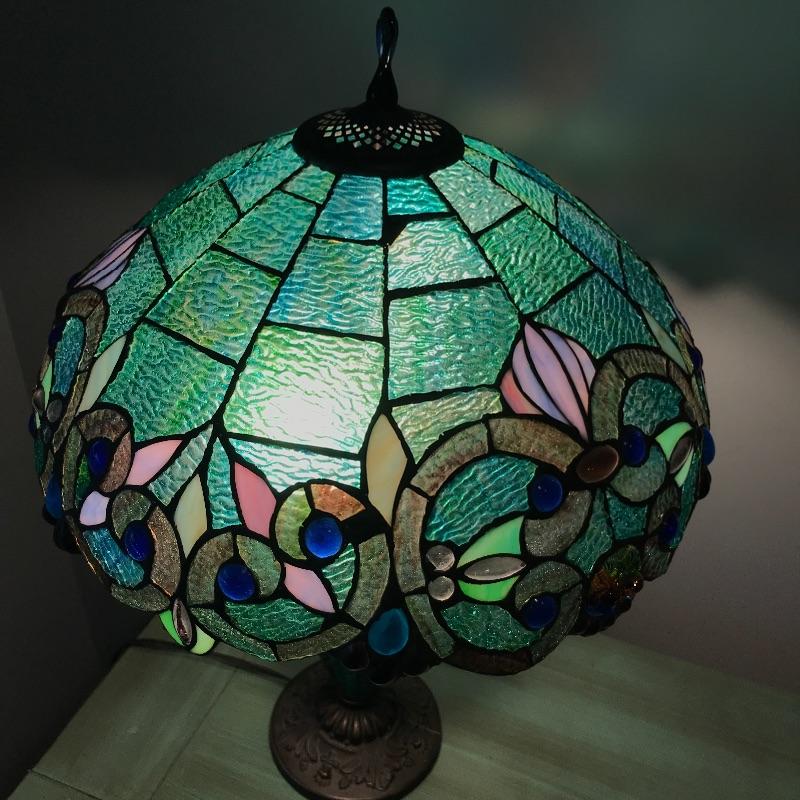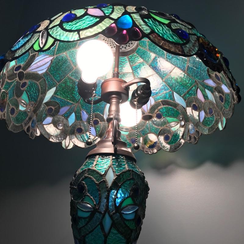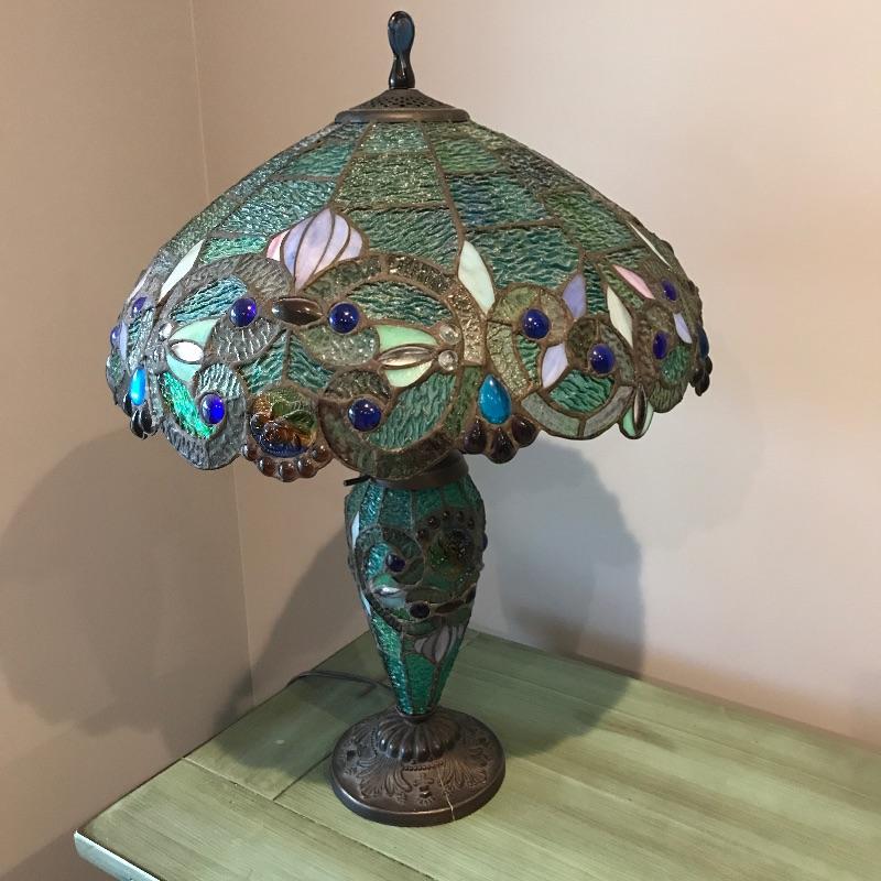 This elegant Tiffany style table lamp comes in attractive green hues with pink, purple and blue embellishments. Lamp has two bulbs and the base lights up. Base has a small crack that does not affect the sturdiness of lamp. see pictures. Lamp measures 24” tall with a 18”D. Shipping available. Item is heavy.